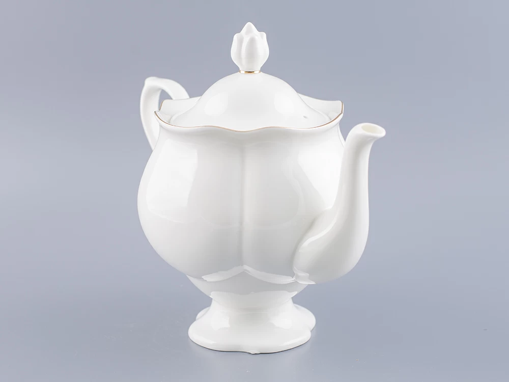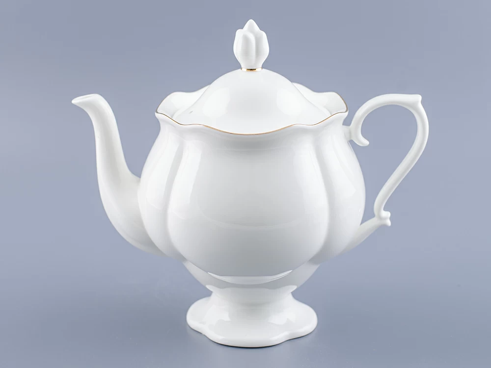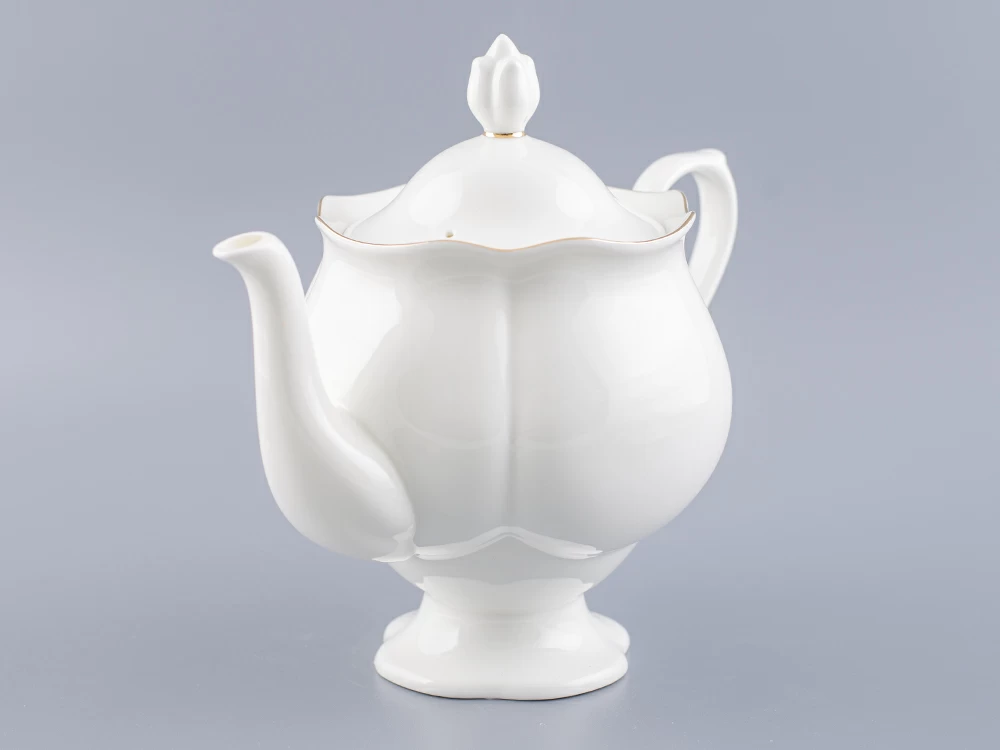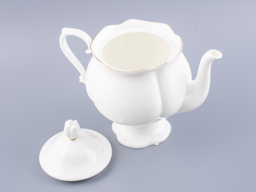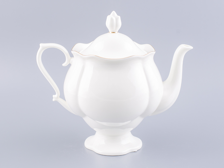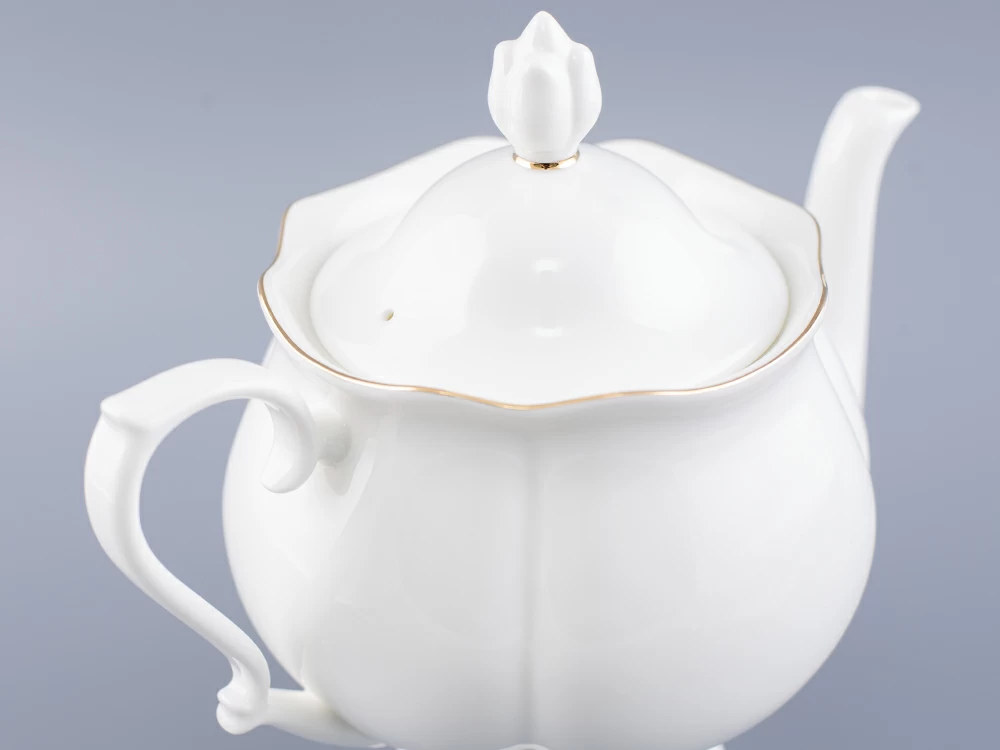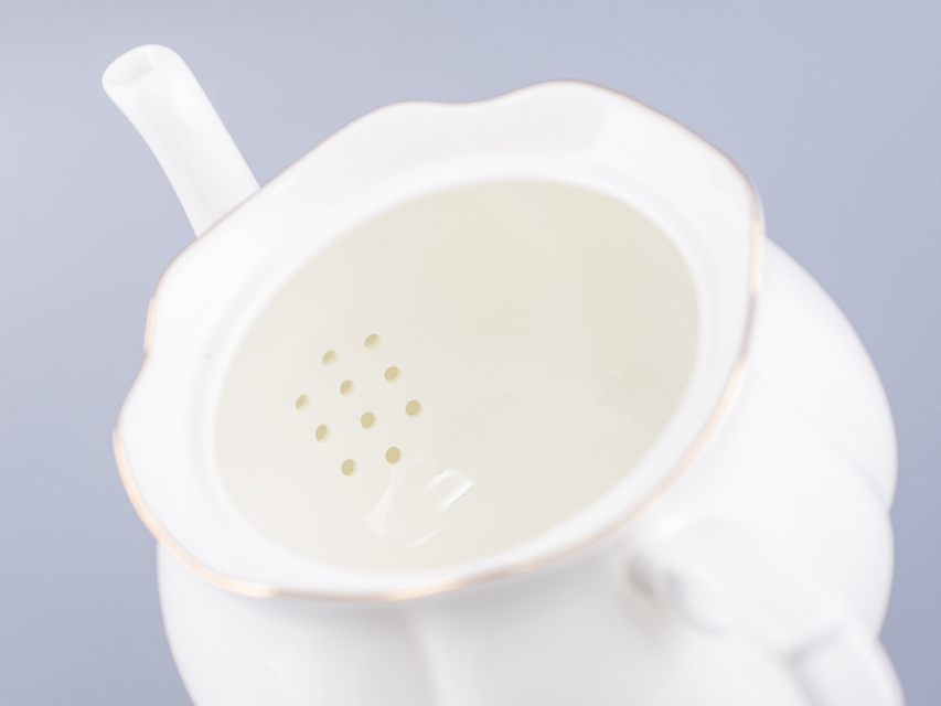 Чайник выполнен из уникального костяного тонкостенного фарфора, изобретенного на ИФЗ в 60-х годах XX века. По белизне, тончайшему слою глазури и воздушности он более всего напоминает сорт старинного китайского фарфора «яичная скорлупа». Изысканная отводка, нанесенная натуральным золотом, деликатно обыгрывает белоснежную поверхность изделий, дополняет легкий, светлый образ, подчеркивает хрупкость материала, изящную форму предметов и благородство фарфорового ансамбля.