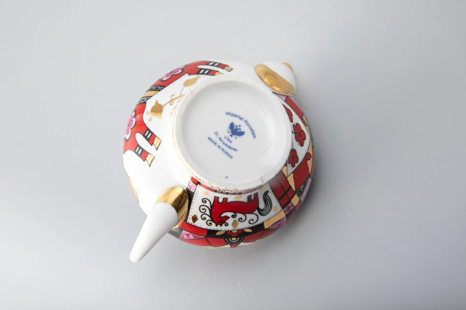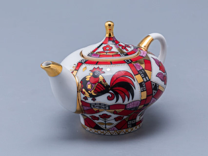 Художественное оформление чайника создано выдающимся художником Алексеем Воробьевским (1906-1992), творчество которого – это чудесные фантазии, сказочные пейзажи и волшебство. Также художник обращался к нарядным мотивам русского народного искусства, переосмысливал элементы древнерусского орнамента. В результате Алексей Воробьевский разработал собственный самобытный «русский» стиль с яркой цветовой палитрой и точной прорисовкой деталей, что прекрасно демонстрирует рисунок «Красный конь».