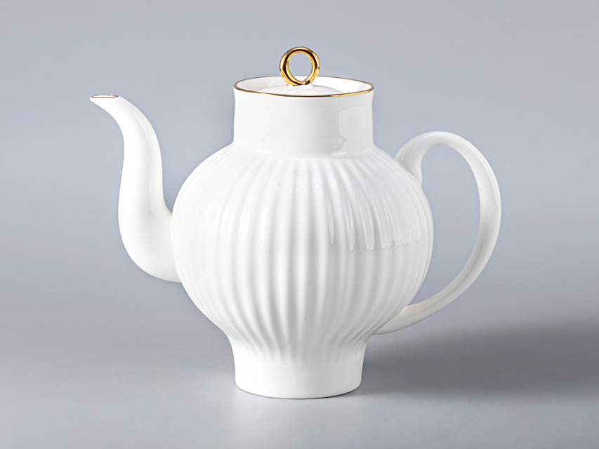 Чайник рис. «Золотой кантик» изготовлен на Императорском фарфоровом заводе из костяного фарфора с отводкой золотом вручную. От обычного фарфора его отличает повышенная белизна, тончайший слой глазури, и та воздушность, которая была свойственна знаменитому сорту старинного китайского фарфора под названием «яичная скорлупа».