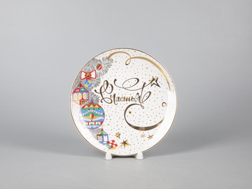 Декоративная тарелка "Счастья" входит в серию из трех тарелок "Счастливый год". Интерьерный аксессуар с добрым пожеланием украшен очаровательной композицией из еловых веточек и новогодних игрушек. Такая тарелка поможет создать дома праздничное настроение и уют, а также станет замечательным подарком и для себя, и для близких.