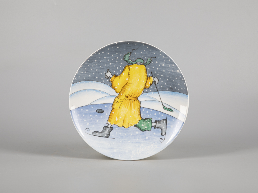 Декоративная тарелка серии "Зима" новинка 2022 года - входит в коллекцию "Мир в каплях воды". Как и в других своих работах, Михаил Шемякин изображает персонажа, играющего в любимую многими зимнюю забаву - хоккей. Рисунок специально адаптирован к фарфору, который Михаил Шемякин тонко чувствует и понимает, создавая оригинальные произведения, с присущим художнику видением мира и высочайшим мастерством, воплощенным в материале.
