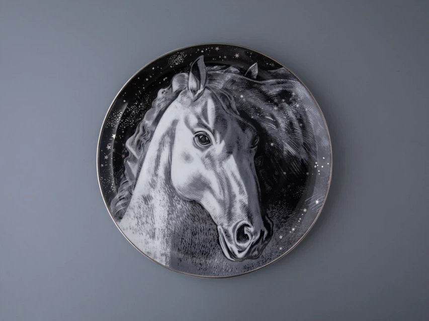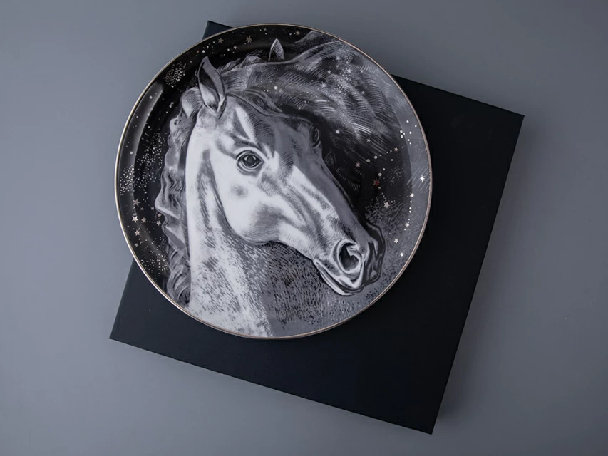 Рисунок на декоративной тарелке становится проводником в захватывающий мир свободы и приключений. А вашим спутником при этом становится мудрый, вольный мустанг. Четкие линии подчеркивают энергичную натуру дикого животного, а сочетание черного цвета с белоснежным костяным фарфором придает композиции особую глубину и контрастность. Дополняет рисунок ночное небо с мерцающими звездами – аллюзия к воплощению мечты и бесконечным возможностям. Декоративная тарелка станет яркий дополнением интерьера, а расположить ее можно не только на полке, но и повесить на стену (для этого предусмотрены крепления). Декоративная тарелка представлена в эксклюзивной подарочной упаковке.