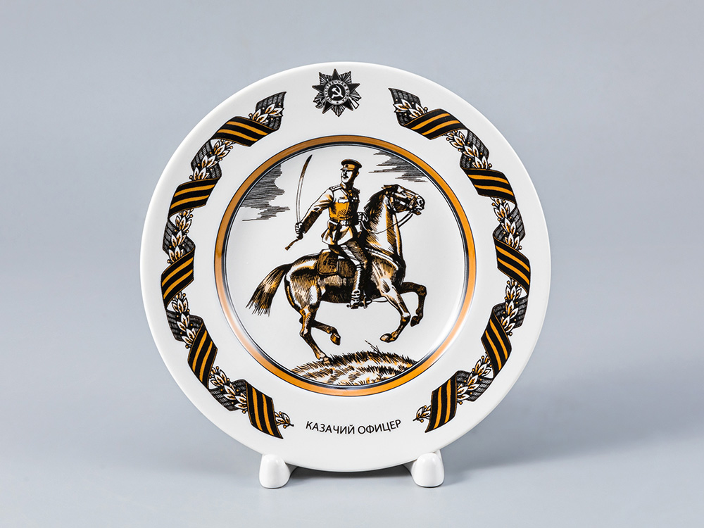 События Великой Отечественной войны – одна из значимых тем для художников Императорского фарфорового завода. В честь 70-летия Великой Победы, в память о бессмертном подвиге народа, Императорский фарфоровый завод выпустил коллекционную серию декоративных фарфоровых тарелок «Солдаты Великой Победы». На тарелках изображены люди разных военных профессий, собирательные образы героев войны 1941-1945 гг.: разудалый казачий офицер, решительный пехотинец, отважный летчик, бесстрашный танкист и другие персонажи. Рисунок, заключенный в классический медальон, очаровывает тонкой графикой и трепетным отношением к деталям. Борт тарелок украшает георгиевская лента – символ Великой Победы, переплетенная с лавровыми ветками символизирующими мир, славу победителей и триумф над соперником.