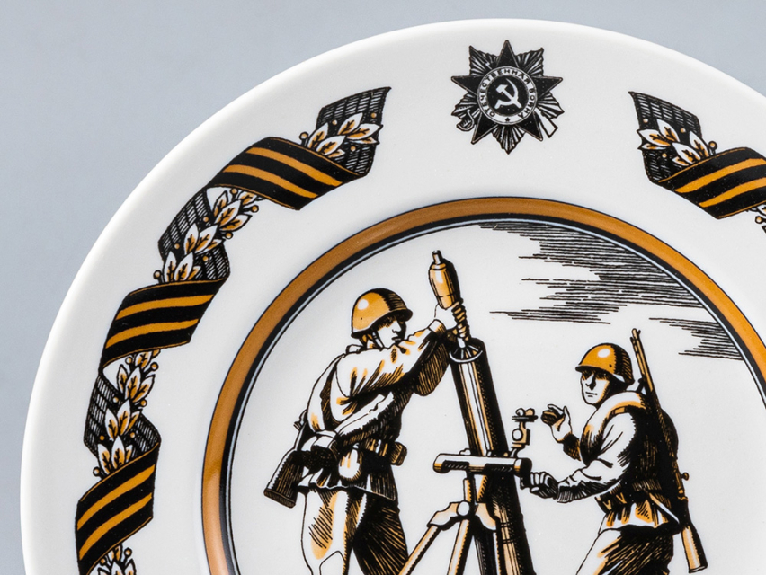 События Великой Отечественной войны – одна из значимых тем для художников Императорского фарфорового завода. В честь 70-летия Великой Победы, в память о бессмертном подвиге народа, Императорский фарфоровый завод выпустил коллекционную серию декоративных фарфоровых тарелок «Солдаты Великой Победы». На тарелках изображены люди разных военных профессий, собирательные образы героев войны 1941-1945 гг.: разудалый казачий офицер, решительный пехотинец, отважный летчик, бесстрашный танкист и другие персонажи. Рисунок, заключенный в классический медальон, очаровывает тонкой графикой и трепетным отношением к деталям. Борт тарелок украшает георгиевская лента – символ Великой Победы, переплетенная с лавровыми ветками символизирующими мир, славу победителей и триумф над соперником.