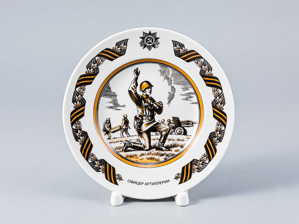 События Великой Отечественной войны – одна из значимых тем для художников Императорского фарфорового завода. В честь 70-летия Великой Победы, в память о бессмертном подвиге народа, Императорский фарфоровый завод выпустил коллекционную серию декоративных фарфоровых тарелок «Солдаты Великой Победы». На тарелках изображены люди разных военных профессий, собирательные образы героев войны 1941-1945 гг.: разудалый казачий офицер, решительный пехотинец, отважный летчик, бесстрашный танкист и другие персонажи. Рисунок, заключенный в классический медальон, очаровывает тонкой графикой и трепетным отношением к деталям. Борт тарелок украшает георгиевская лента – символ Великой Победы, переплетенная с лавровыми ветками символизирующими мир, славу победителей и триумф над соперником.