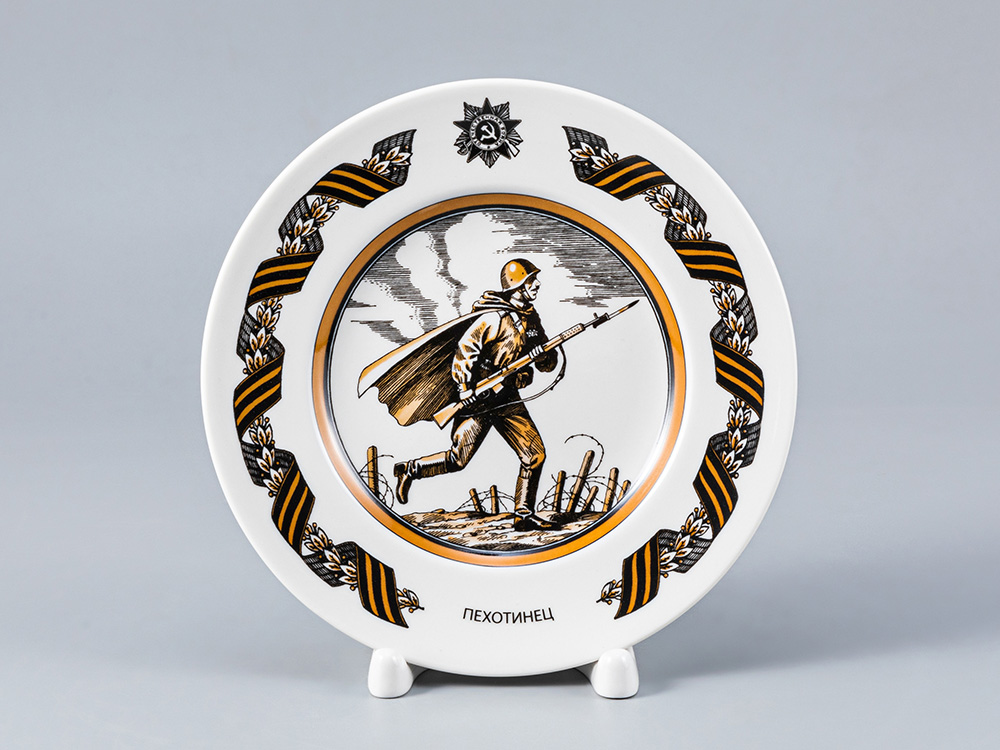 События Великой Отечественной войны – одна из значимых тем для художников Императорского фарфорового завода. В честь 70-летия Великой Победы, в память о бессмертном подвиге народа, Императорский фарфоровый завод выпустил коллекционную серию декоративных фарфоровых тарелок «Солдаты Великой Победы». На тарелках изображены люди разных военных профессий, собирательные образы героев войны 1941-1945 гг.: разудалый казачий офицер, решительный пехотинец, отважный летчик, бесстрашный танкист и другие персонажи. Рисунок, заключенный в классический медальон, очаровывает тонкой графикой и трепетным отношением к деталям. Борт тарелок украшает георгиевская лента – символ Великой Победы, переплетенная с лавровыми ветками символизирующими мир, славу победителей и триумф над соперником.