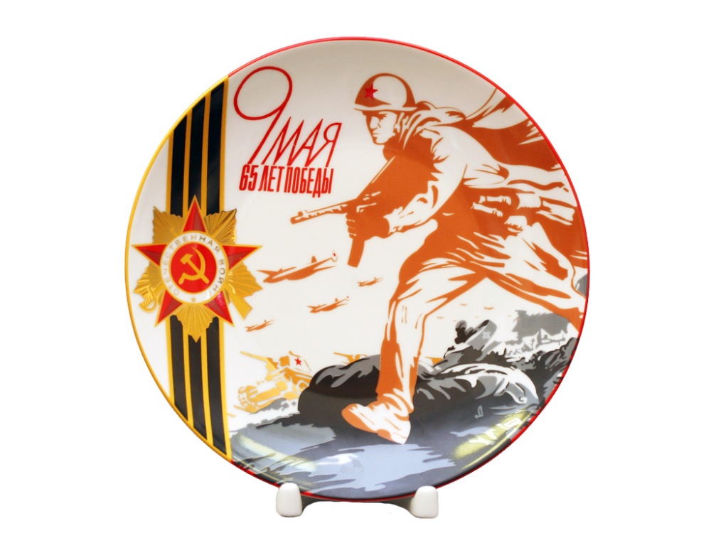 Тарелка «9 мая. 65 лет Победы» создана на основе плаката времен Великой Отечественной войны «По вражьей земле, вперед к Победе!», выполненного известным советским графиком Николаем Михайловичем Авакумовым (1908 – 1945). В годы войны Н.М. Авакумов создал огромное количество рисунков, портретов и плакатов для газеты «Фронтовик», издававшейся в 3-й ударной армии. Не расставаясь на военных дорогах с карандашом и планшетом, он запечатлел в беглых фронтовых зарисовках героические сражения, солдатские будни и героев войны. Декор фарфоровой тарелки дополнен Георгиевской лентой, на фоне которой размещена звезда Ордена Отечественной войны.