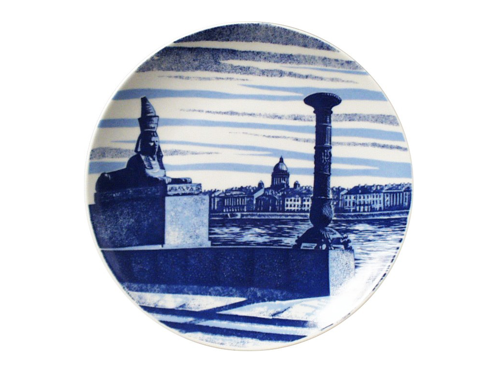 Культовый вид на Исаакиевский собор и одного из двух сфинксов на Университетской набережной изображает художник ИФЗ Татьяна Львовна Чарина в глубоких синих оттенках. Гости из древних Фив, возраст которых достиг более 35 веков, органично влились в пространство города и теперь стерегут его мир и спокойствие от зловещих сил. В созвучных своему творчеству кобальтовых тонах художник заключает образ города на Неве в мастерски выполненную декоративную тарелку из фарфора высочайшего качества.