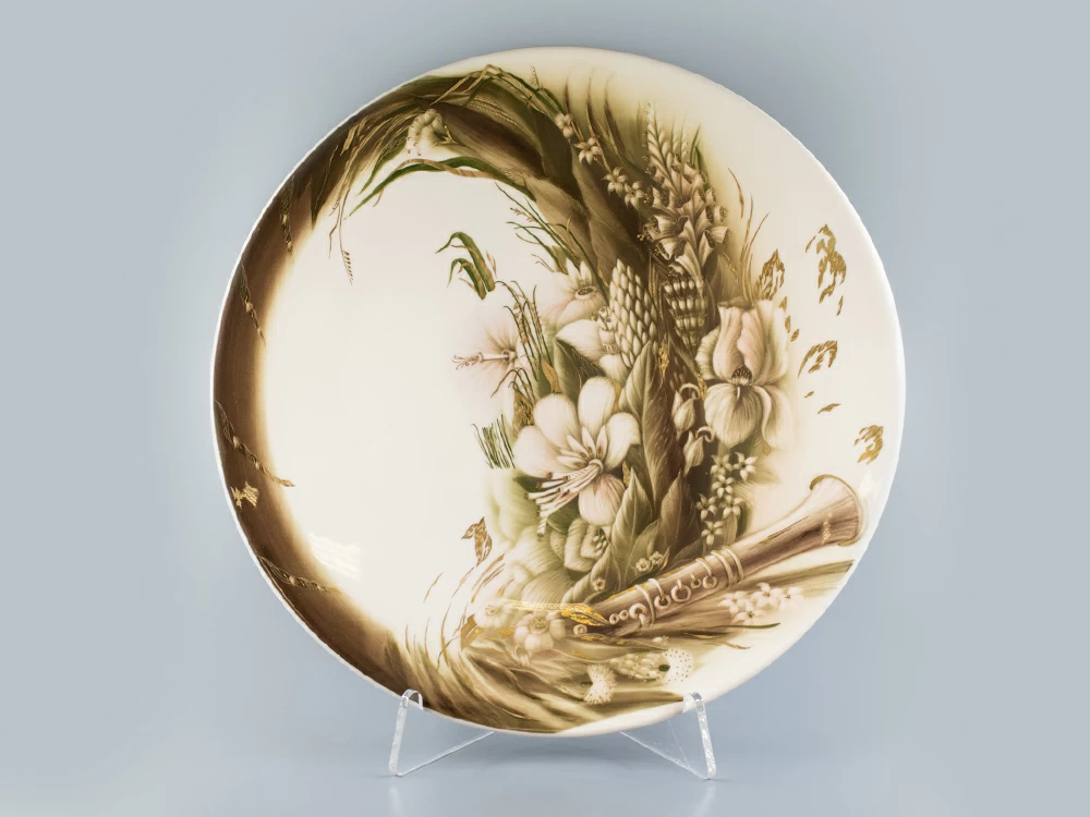 Изысканная роспись и колорит блюда «Утро туманное» навевают воспоминания о свежести раннего деревенского утра: легкий ветер всколыхнул разнотравье луга и с высоких стеблей скатились капли росы, первые лучи солнца упали на лепестки нежных цветов. Композиция исполнена в теплой гамме подглазурной росписи, особенности которой помогли автору передать прозрачную утреннюю дымку, ощущение легкости и покоя.