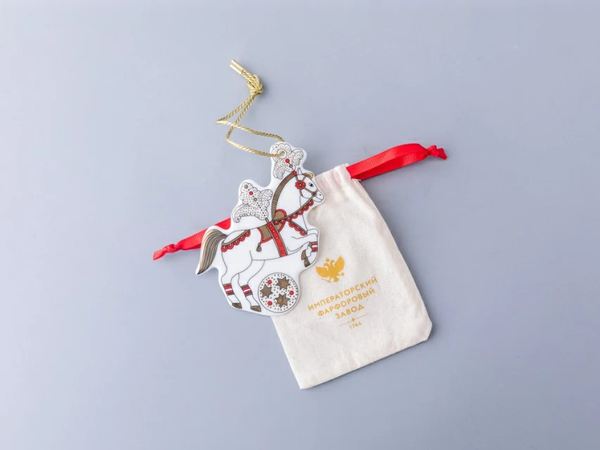 Елочное украшение «Лошадка» из серии Grand Cirque Vintage приглашает отправиться в увлекательное путешествие по чудесному миру цирка и детских воспоминаний. Художник Любовь Цветкова создала оригинальный рисунок с лошадью, черпая вдохновение в афишах знаменитого Цирка Чинизелли и уникальных архивных снимках начала XX века. Цирковые номера того времени включали выступления дрессированных животных, среди которых – представления с лошадьми, которые пользовались большой популярностью. Кроме того, у игрушки есть «изюминка»: логотип ИФЗ является частью композиции на фарфоре.