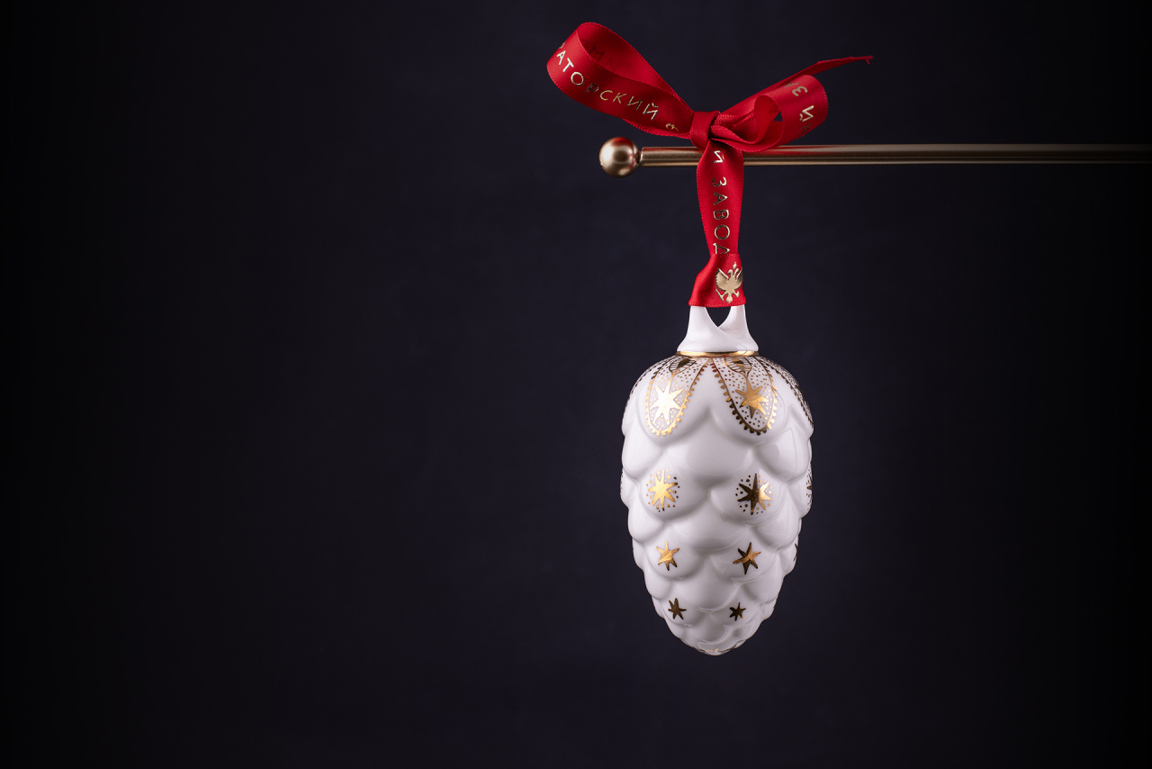 Елочная игрушка изготовлена на Императорском фарфоровом заводе из костяного фарфора.