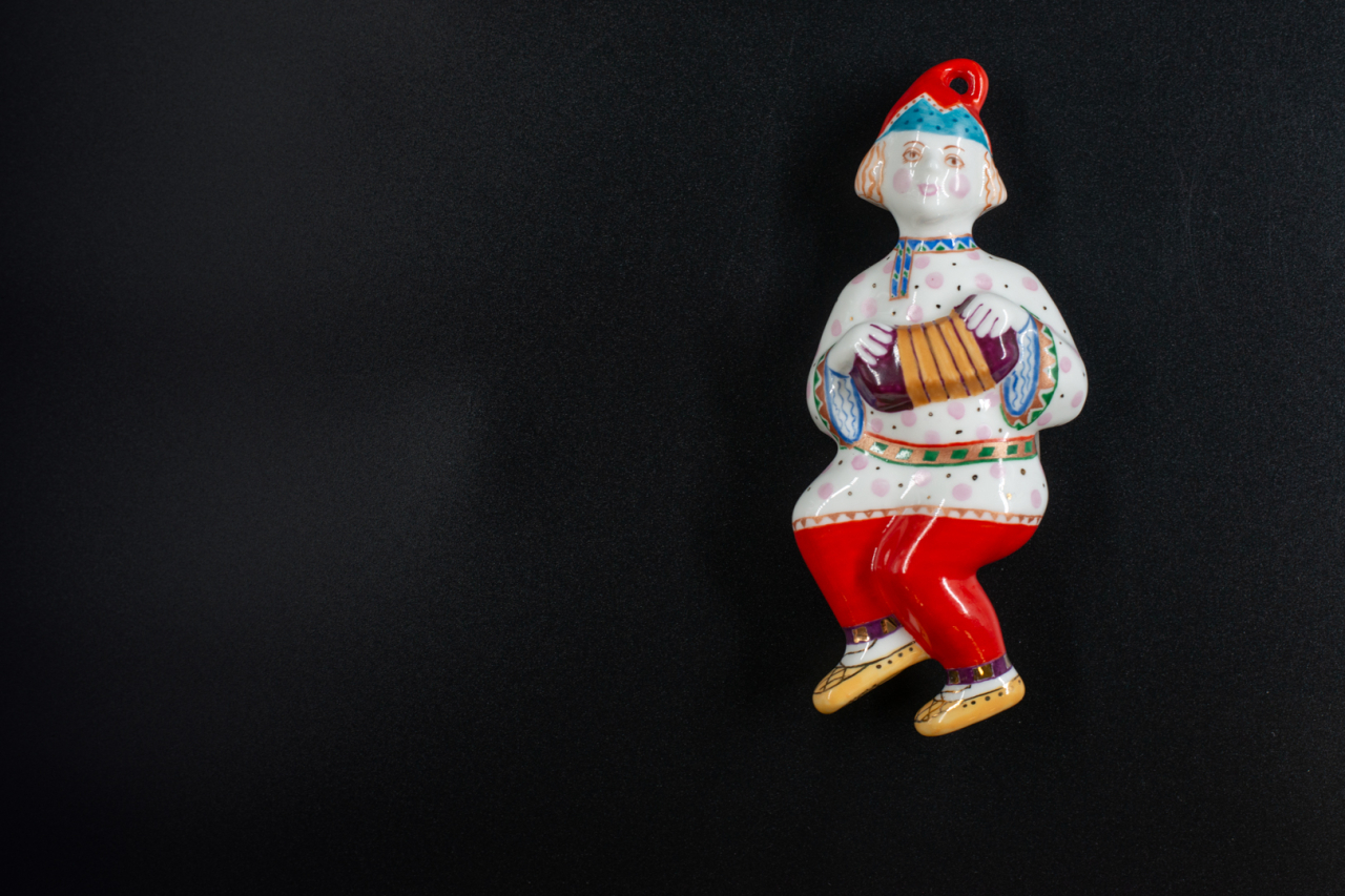 Многие художники и скульпторы завода продолжают обширную коллекцию фарфора, посвященную русскому фольклору и народными персонажами. Особого внимания заслуживает серия игрушек с росписью Марии Матвеевой. Посвящена она традиционным ярмарочным развлечениям, где центральное место занимают фигуры скоморохов с различными музыкальными инструментами и медведь с бубном. Эти образы олицетворяют яркую и самобытную культуру народных гуляний, передавая дух эпохи, когда праздник был не только временем радости, но и важным событием.
