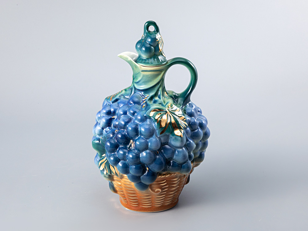 Графин "Виноград в корзине" (синий) изготовлен на Императорском фарфоровом заводе из твердого фарфора. Форма отливается вручную. Для декорирования используется ручная подглазурная и надглазурная роспись. Автор формы и рисунка - Бронислав Быструшкин. Форма и рисунок "Виноград в корзине" созданы в 1954 году Быструшкиным Брониславом Дмитриевичем. Именно этот графин стал первой работой художника на ЛФЗ. Выпуск изделия начался в 1955 году. Объем - 1160 мл, высота - 23.5 см., диаметр - 15,2 см. , вес 800 грамм.