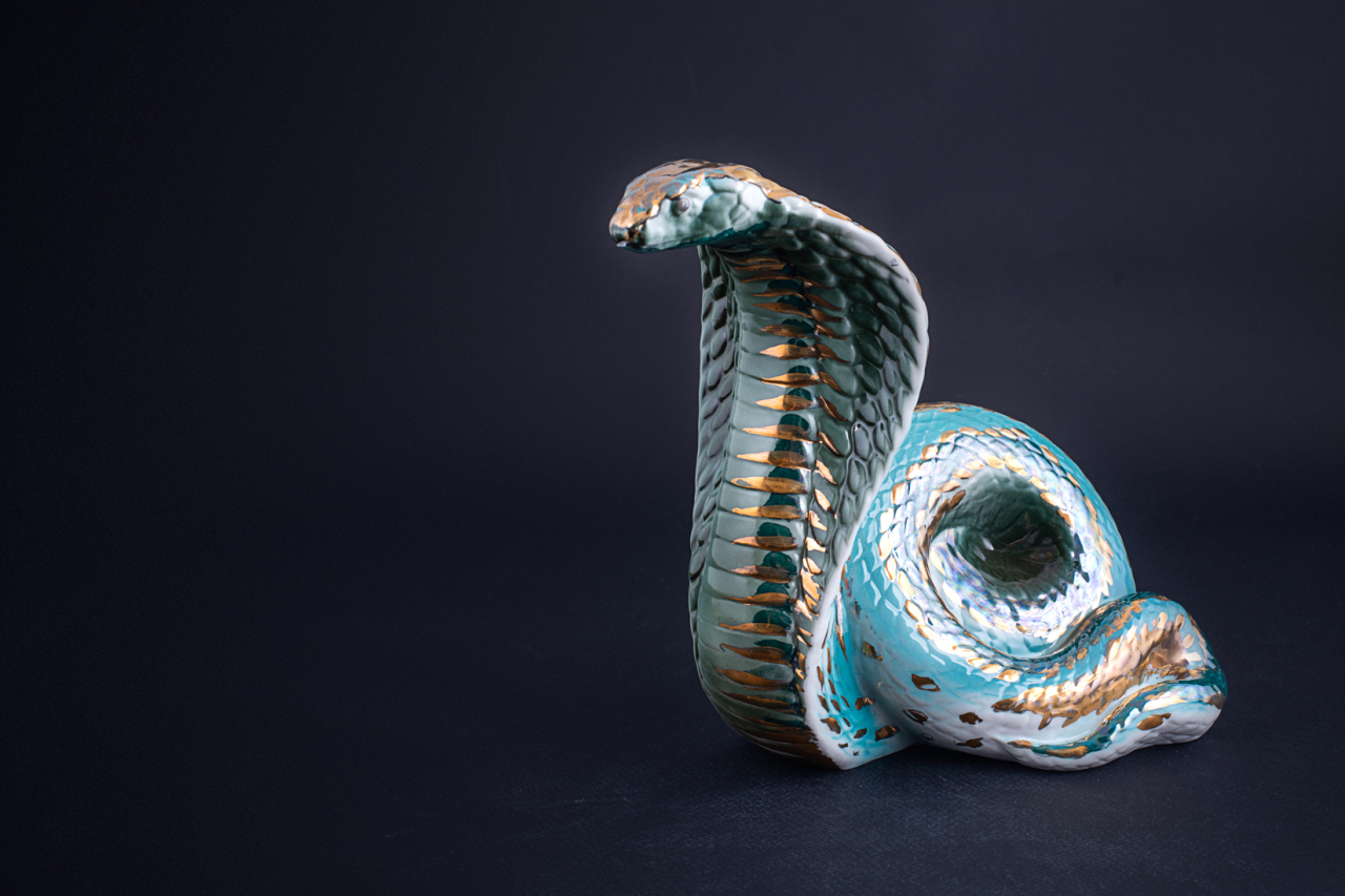 Красота и исключительная сила кобры издревле привлекали внимание людей. Несмотря на то, что кобра является достаточно противоречивым символом, многие культуры почитают ее как существо мудрое, ассоциирующееся с долголетием и силой. В росписи скульптуры автор оригинально обыгрывает текстуру змеиной кожи, украшая голову змеи и ее тело фрагментами мозаики.