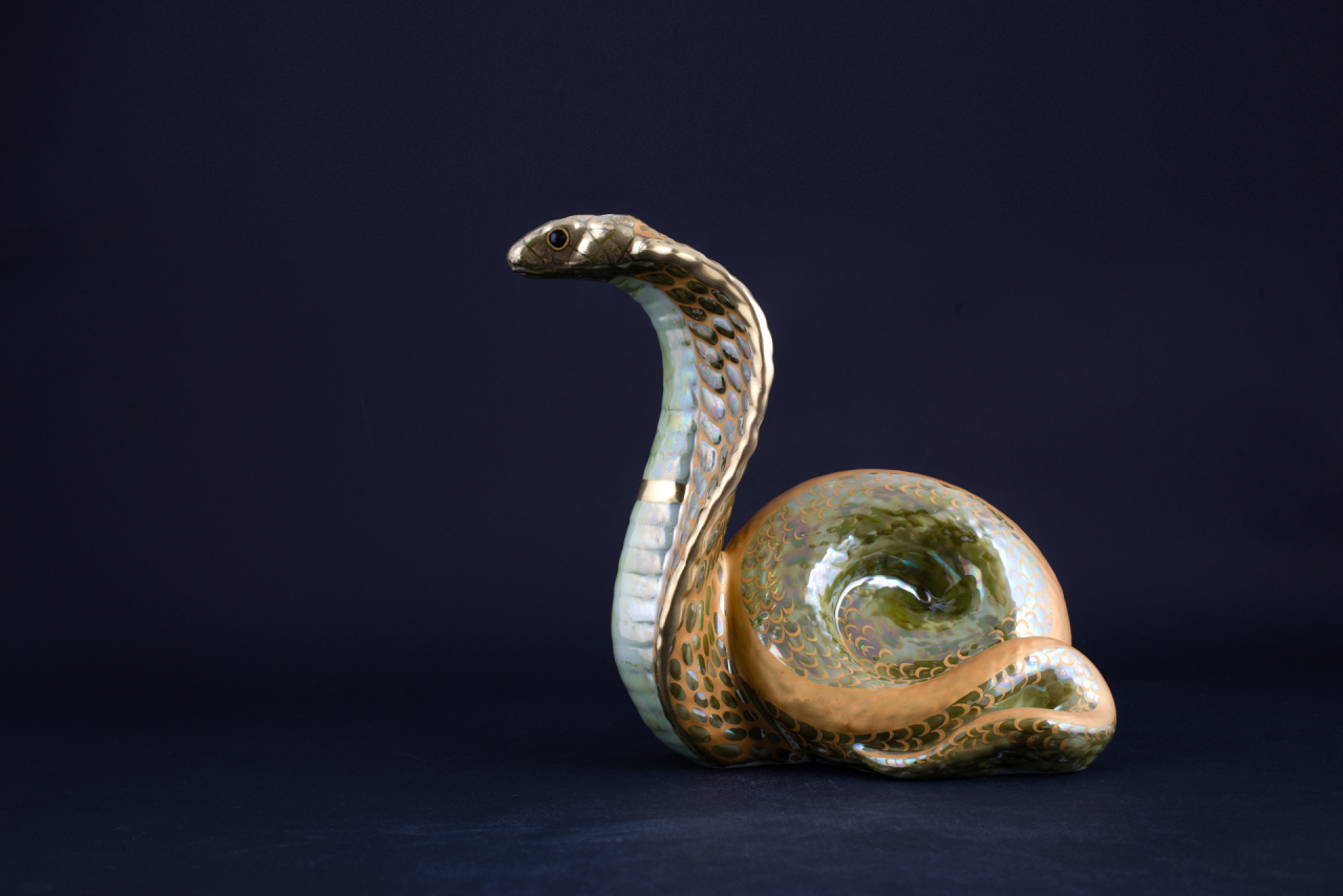 Красота и исключительная сила кобры издревле привлекали внимание людей. Несмотря на то, что кобра является достаточно противоречивым символом, многие культуры почитают ее как существо мудрое, ассоциирующееся с долголетием и силой. В росписи скульптуры автор оригинально обыгрывает текстуру змеиной кожи, украшая голову змеи и ее тело фрагментами мозаики.