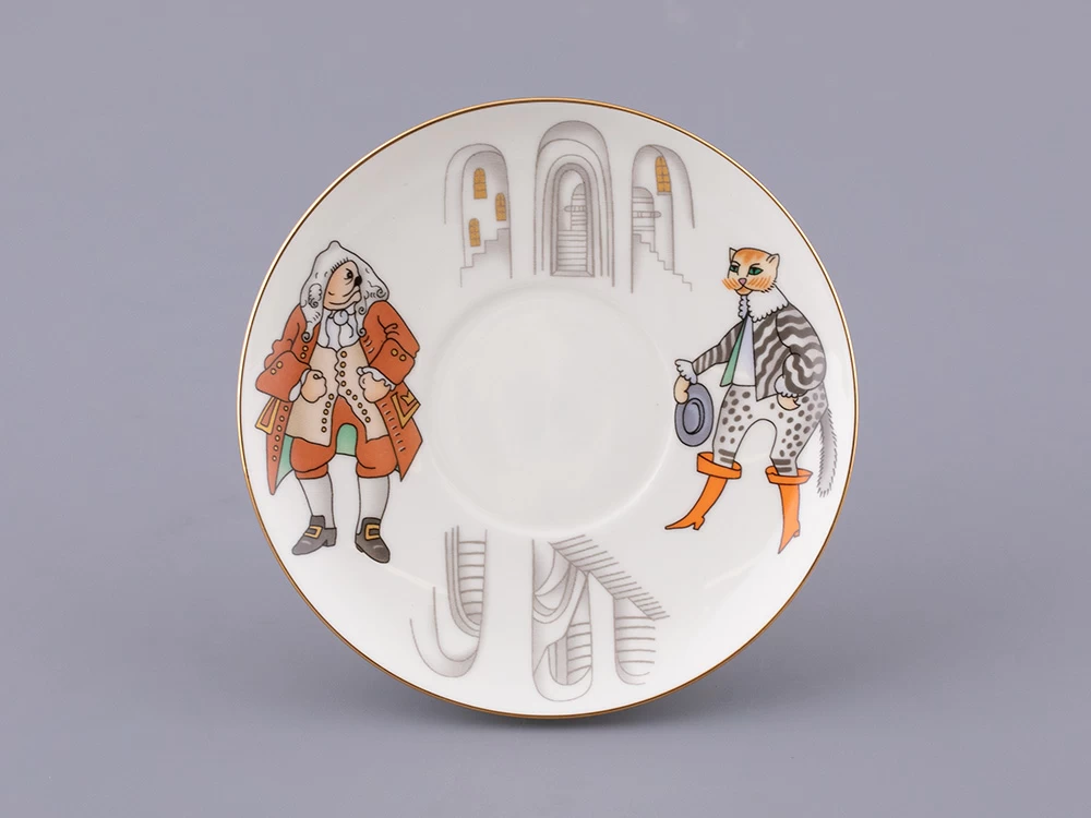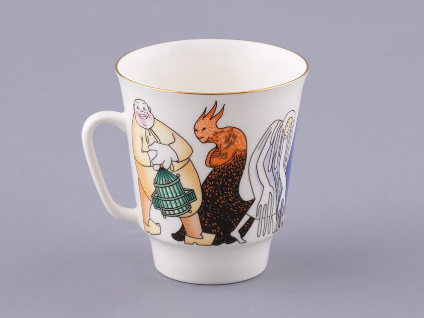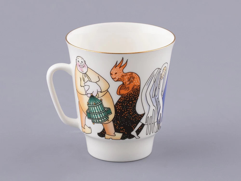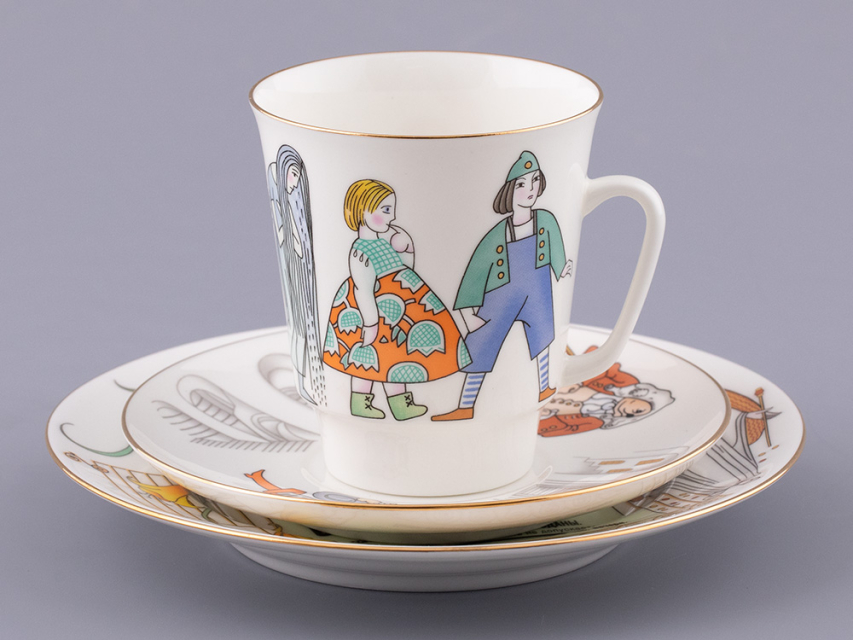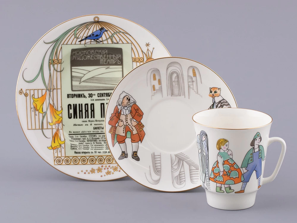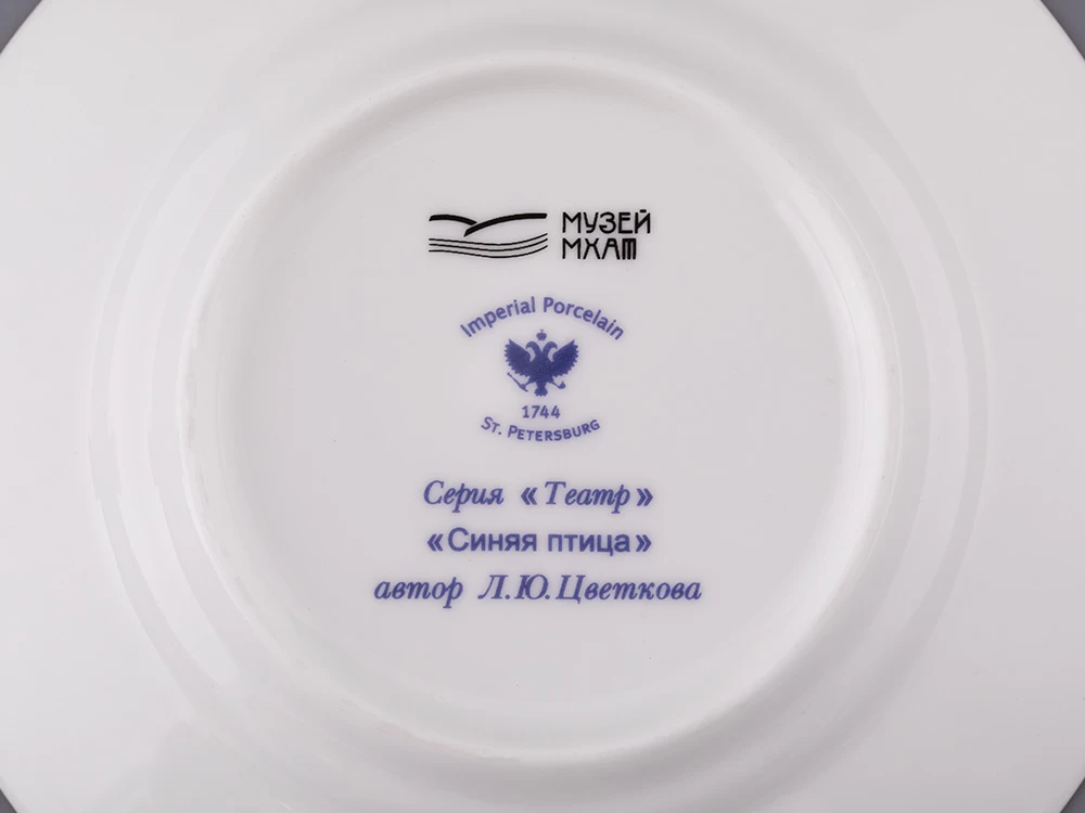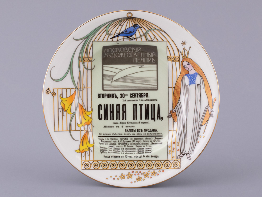 Трёхпредметный комплект «Синяя птица» стал продолжением серии фарфора, созданной совместно с Московским Художественным театром имени А. П. Чехова (МХТ). Этот комплект, рисунки для которого разработала ведущий художник завода Любовь Цветкова, является восхитительным воплощением спектакля по одноимённой философской пьесе-притче Мориса Метерлинка. Спектакль был впервые поставлен в МХТ в 1908 году. Режиссёр К. С. Станиславский определил «Синюю птицу» как спектакль, который должен быть наивным, простым, лёгким, жизнерадостным, весёлым и призрачным, как детский сон, и в то же время величавым. Художник Любовь Цветкова на чашке и блюдце изобразила героев пьесы, а на тарелочке – афишу самой первой постановки в МХТ 30 сентября 1908 года. Это позволяет зрителю погрузиться в атмосферу театральной жизни начала XX века, лучше понять замысел автора и режиссера.
