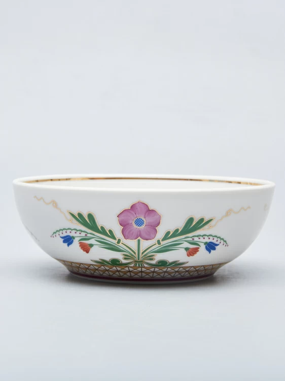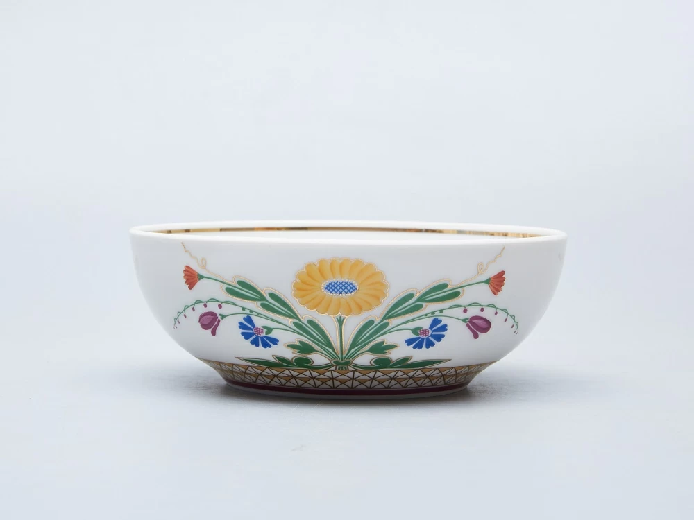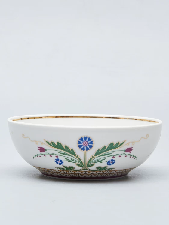 Найденное Галиной Шуляк решение представляет собой авторские вариации на темы «травяных» орнаментов XVII века. В стилизованных соцветиях автор запечатлела обобщенное представление о красоте цветка и красочности русского искусства допетровской поры. Позже по мотивам рисунков были разработаны миски как дополнение к коллекции.