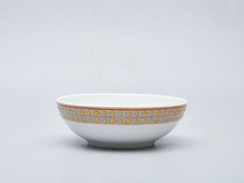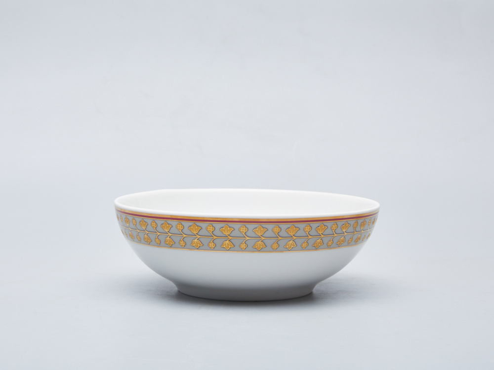 Коллекция «Бельведер» - это современная реплика «Бабигонского» сервиза, исполненного на Императорском фарфоровом заводе в 1824 году для Большого Петергофского дворца. Основной декоративный мотив, использованный в оформлении, – орнаментальная лента, представляющая собой гирлянду из золотых стилизованных листьев на сером фоне в обрамлении тонких малиновых отводок.