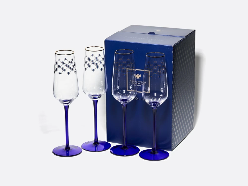 Ни одна трапеза не обходится без напитков. Придать изюминку любой сервировке, сделать ее более стильной поможет линейка столового стекла от Императорского фарфорового завода, в которую вошли бокалы для шампанского. Дизайн сочетает в себе ненавязчивую классику формы с изящным декором. Узкая чаша формы «флейта» долго сохраняет вкус напитка. В оформлении был использован самый известный рисунок ИФЗ – «Кобальтовая сетка».