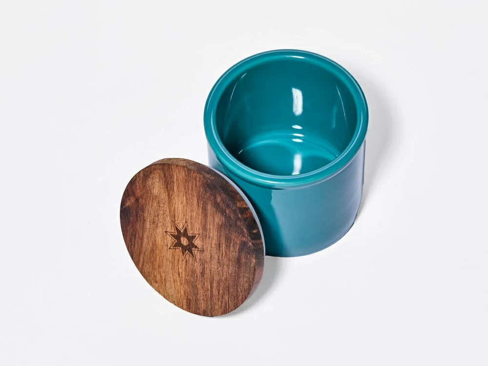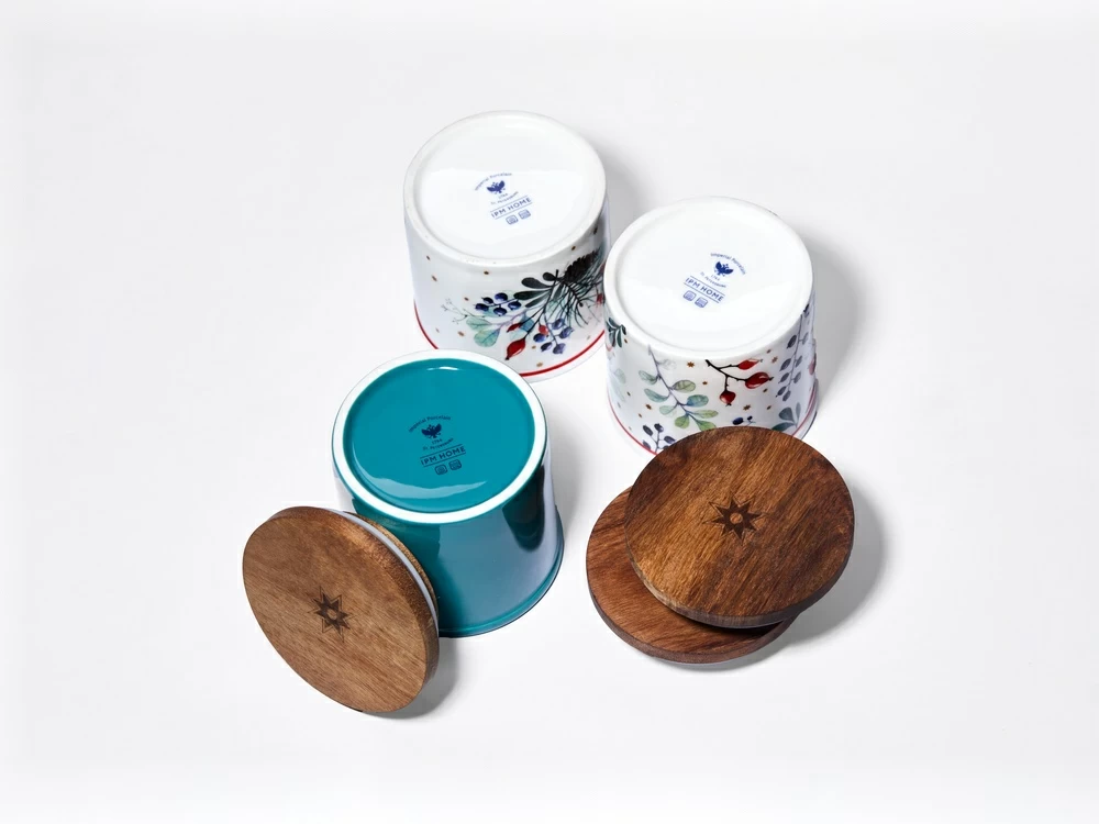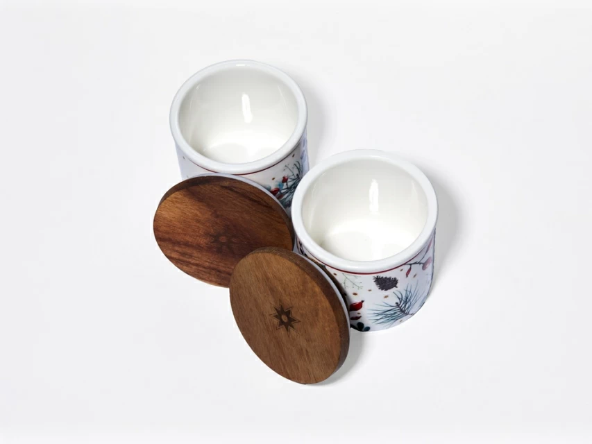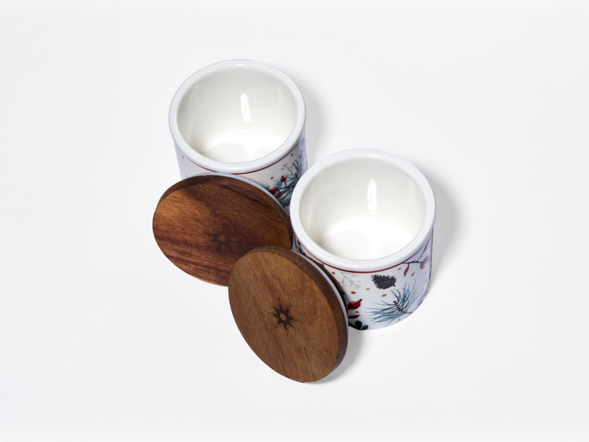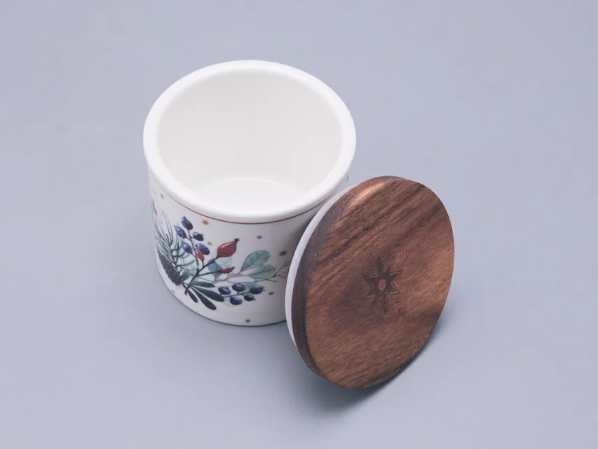 Фарфоровые емкости можно мыть в посудомоечной машине. Деревянные крышки следует ополаскивать вручную и периодически обрабатывать салфеткой с растительным маслом для сохранения внешнего вида. Не замачивайте и не мойте крышки в посудомоечной машине.