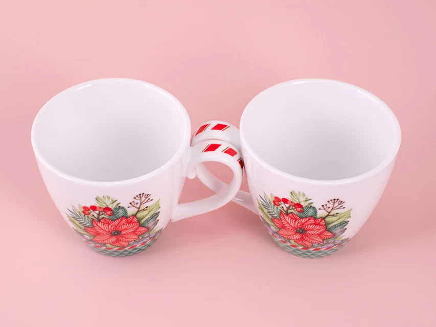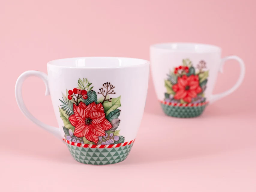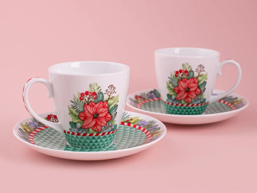 В рисунках авторства Ольги Будашовой зачастую царят растительные мотивы. Как и в других работах автора, в композиции на предметах на бокале с блюдцем «Зимняя история» можно увидеть изображение пуансеттии – рождественской звезды, веточки сосны, остролиста и даже ягоды. Части композиции выполнены таким образом, что напоминают текстуру уютного, теплого пледа. Автор использует свои любимые приемы, задействует чуть приглушенные оттенки и делает растения легкими, воздушными, похожими на акварельную роспись. Нежные оттенки зеленого замечательно сочетаются с контрастным красно-белым узором, напоминающим традиционную новогоднюю конфету.