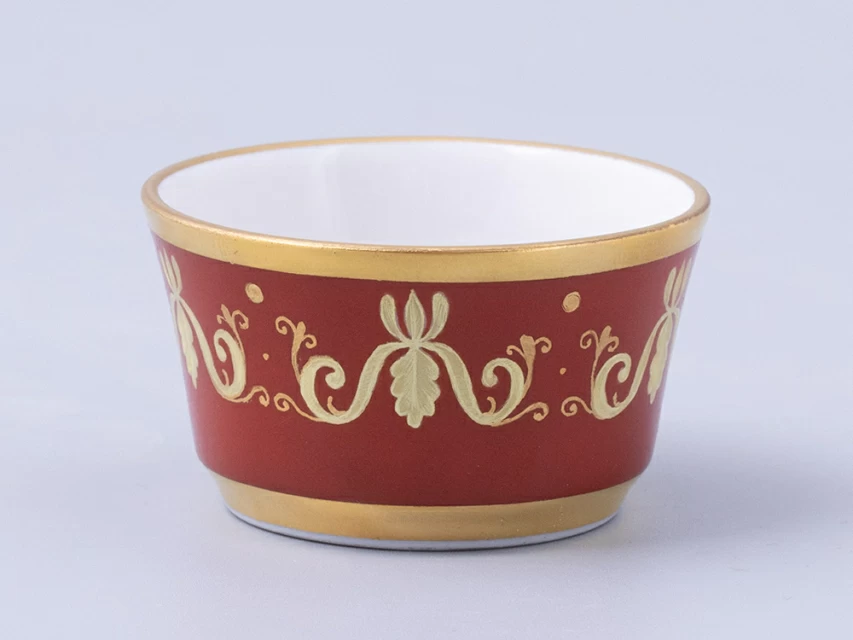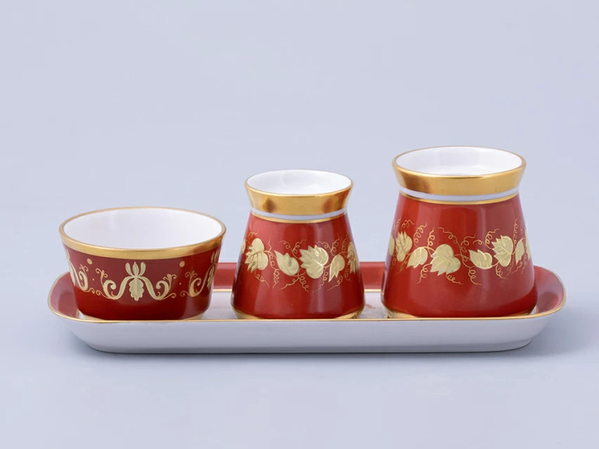 Набор для специй изготовлен на Императорском фарфоровом заводе из твердого фарфора. Для декорирования используется ручная роспись. Авторский оригинал хранится в коллекции Государственного Эрмитажа.