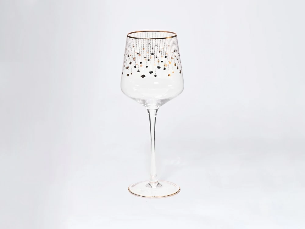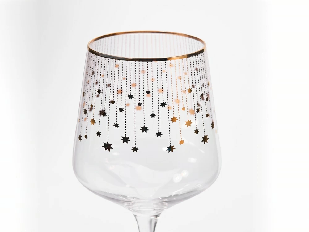 Серия «Азур золотой» продолжила линейку столового стекла от Императорского фарфорового завода Золотые звездочки ниспадающим узором украсили бокалы для вина и шампанского. Переливающийся декор и гармонирующая с ним отводка на ножке бокалов создадут праздничное настроение, подарят нарядность сервировке.