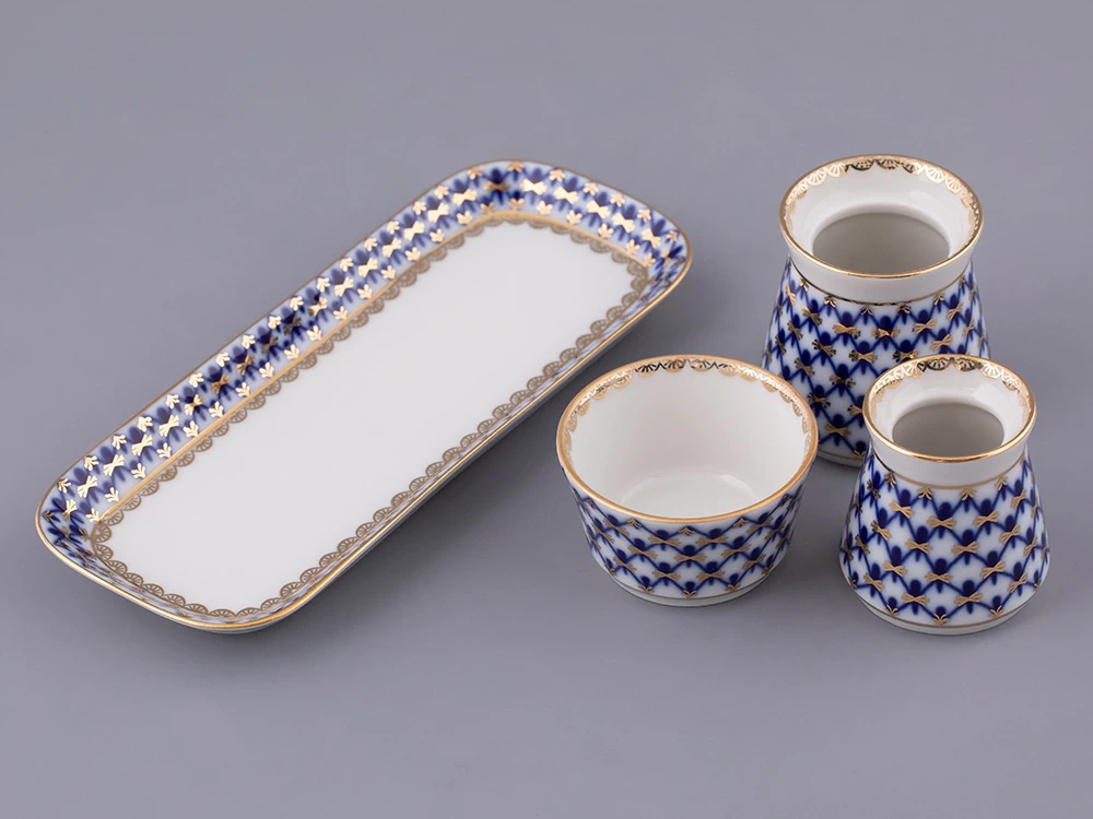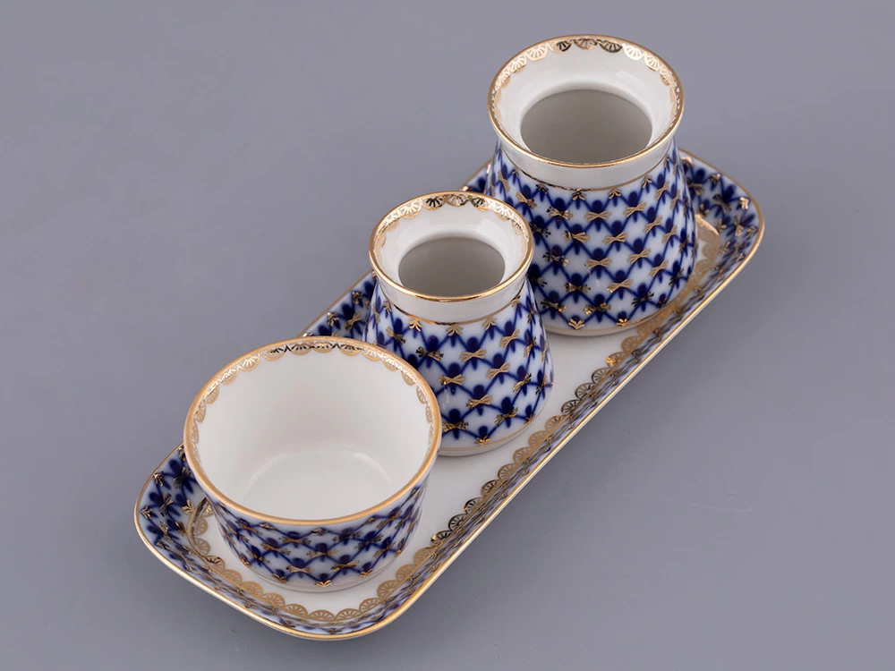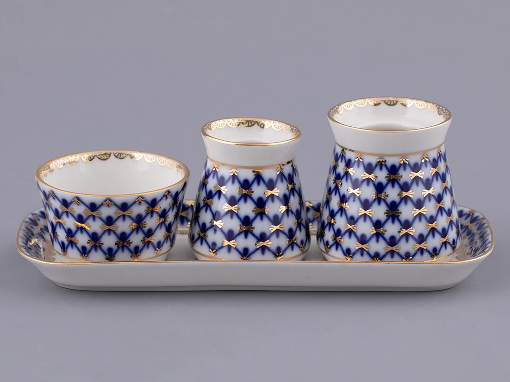 Набор для специй рис. Кобальтовая сетка изготовлен на Императорском фарфоровом заводе из твердого фарфора с элементами ручной росписи. Автор рисунка - Яцкевич А.А. Набор для специй состоит из 4 предметов.