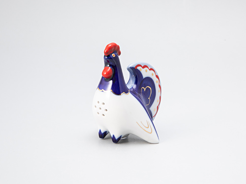 Перечница изготовлена на Императорском фарфоровом заводе из твердого фарфора. Для декорирования используется ручная подглазурная и надглазурная роспись. Автор формы и рисунка - Михаил Мох. Авторская модель создана в 1959 году.