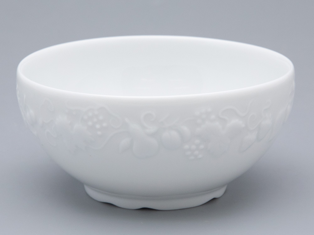 Пиала изготовлена на французском заводе Deshoulieres из твердого фарфора с рельефным рисунком в виде фруктов и овощей. Объем пиалы - 380 мл, диаметр - 12.5 см.