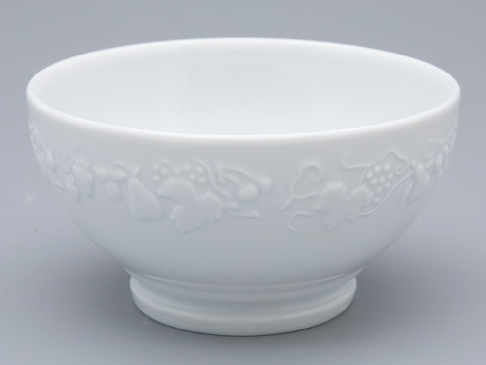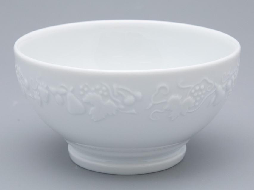 Пиала изготовлена на французском заводе Deshoulieres из твердого фарфора с рельефным рисунком в виде фруктов и овощей. Объем пиалы - 510 мл, диаметр - 14.5 см.