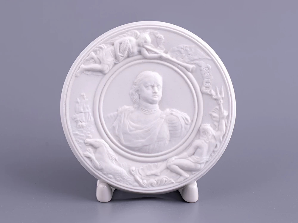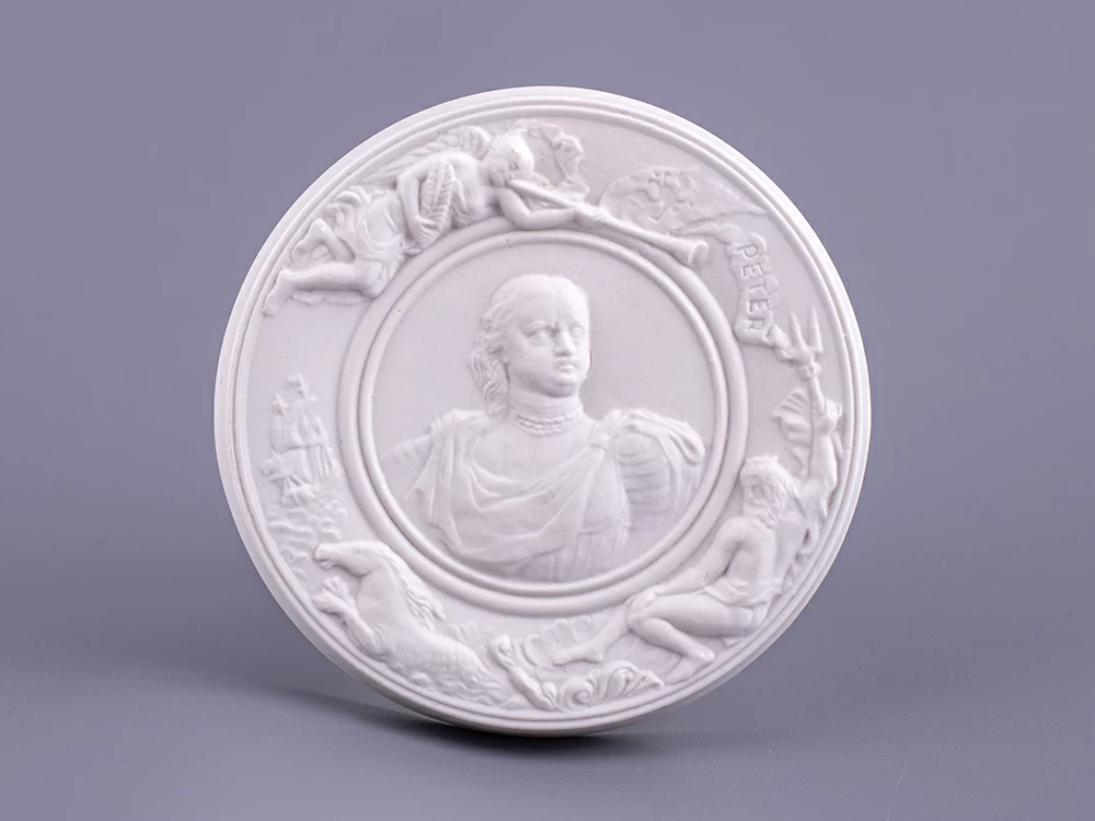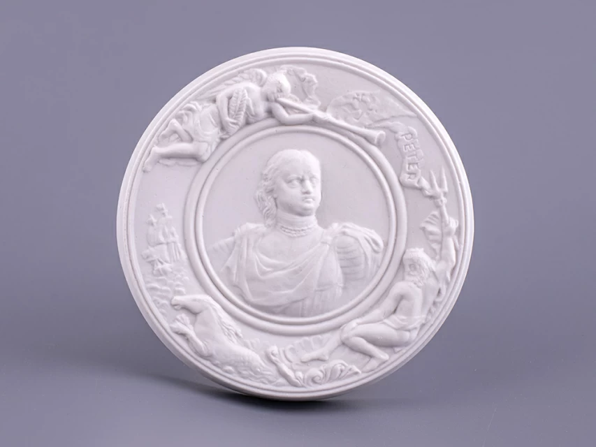 Планкетка с изображением Петра I изготовлена из твердого фарфора на Императорском фарфоровом заводе в 2012 году