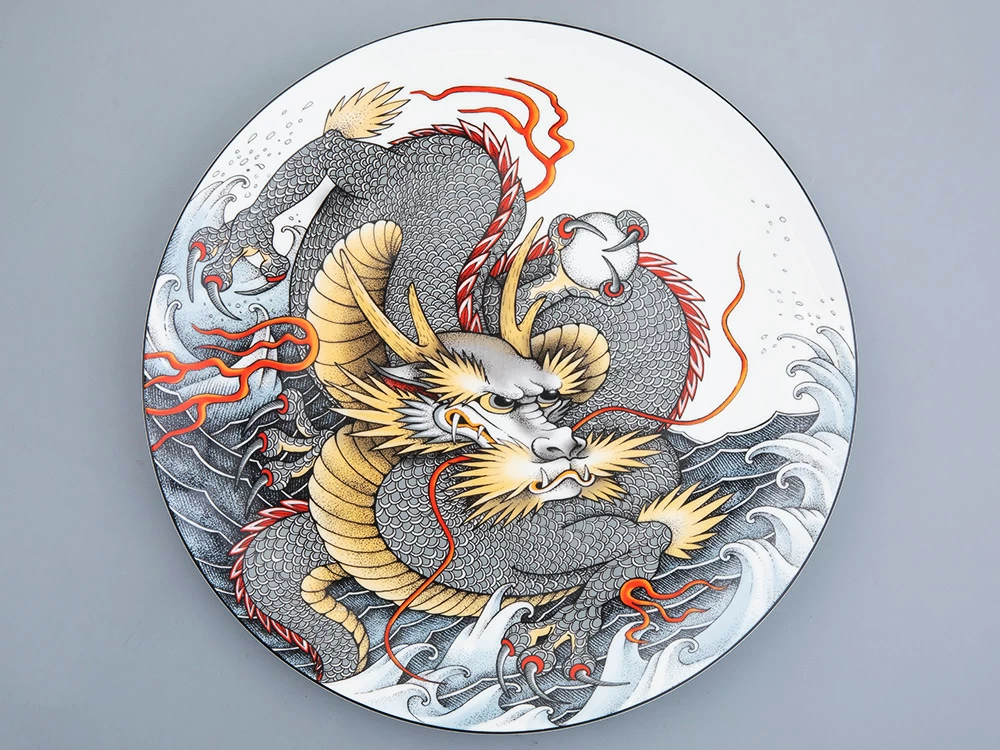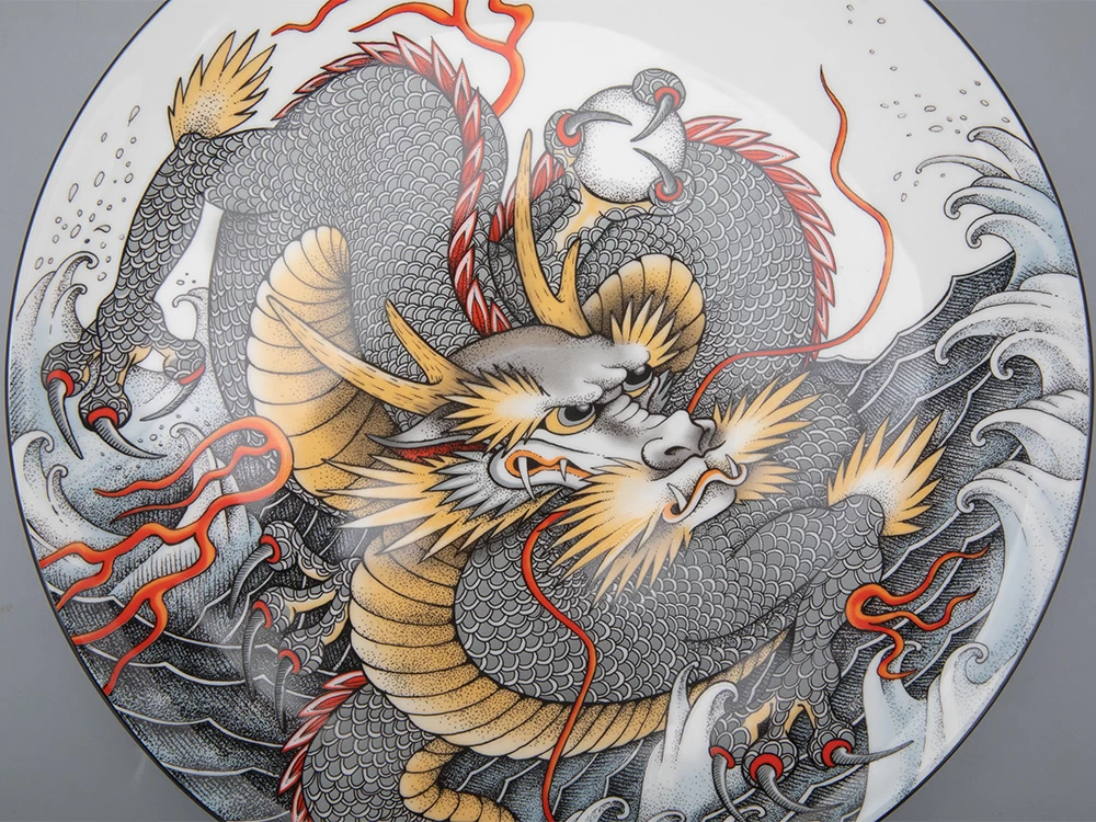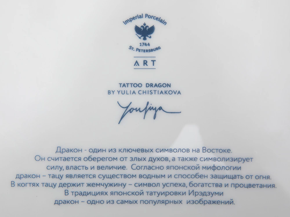 Могучий дракон – тацу – один из ключевых символов в японской культуре. Любопытно, что в отличие от европейской традиции, восточная представляет дракона похожим на змею или ящерицу. У японского дракона также есть своя уникальная черта: три когтя. Этим он отличается от своего китайского собрата – у того их четыре или пять. В когтях тацу держит жемчужину – символ успеха, богатства и процветания. Декоративная тарелка TATTOO Dragon представляет дракона в водной стихии. Согласно японской мифологии дракон является существом водным и способен защищать от огня. Начиная с XVIII века, татуировками с изображением дракона украшали свои тела пожарные. Сегодня дракон является одним из классических сюжетов в японской культуре, считается оберегом от злых духов, а также символизирует силу и власть.