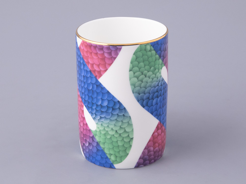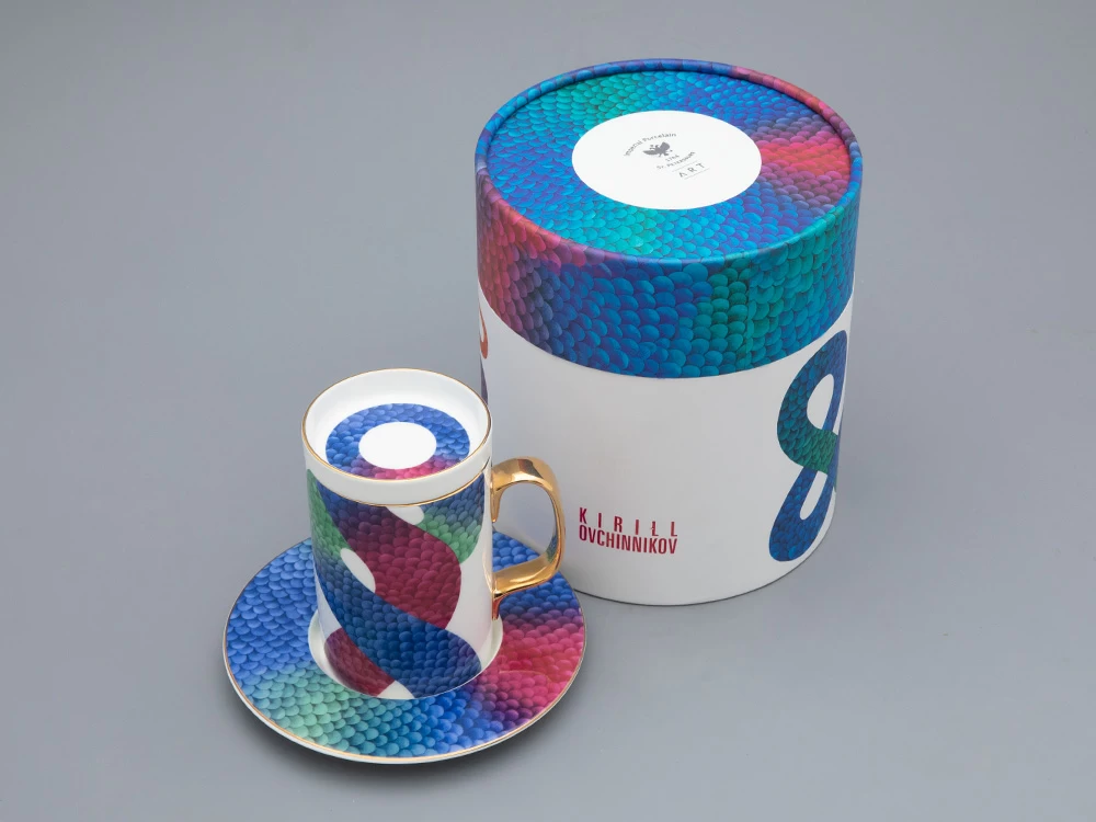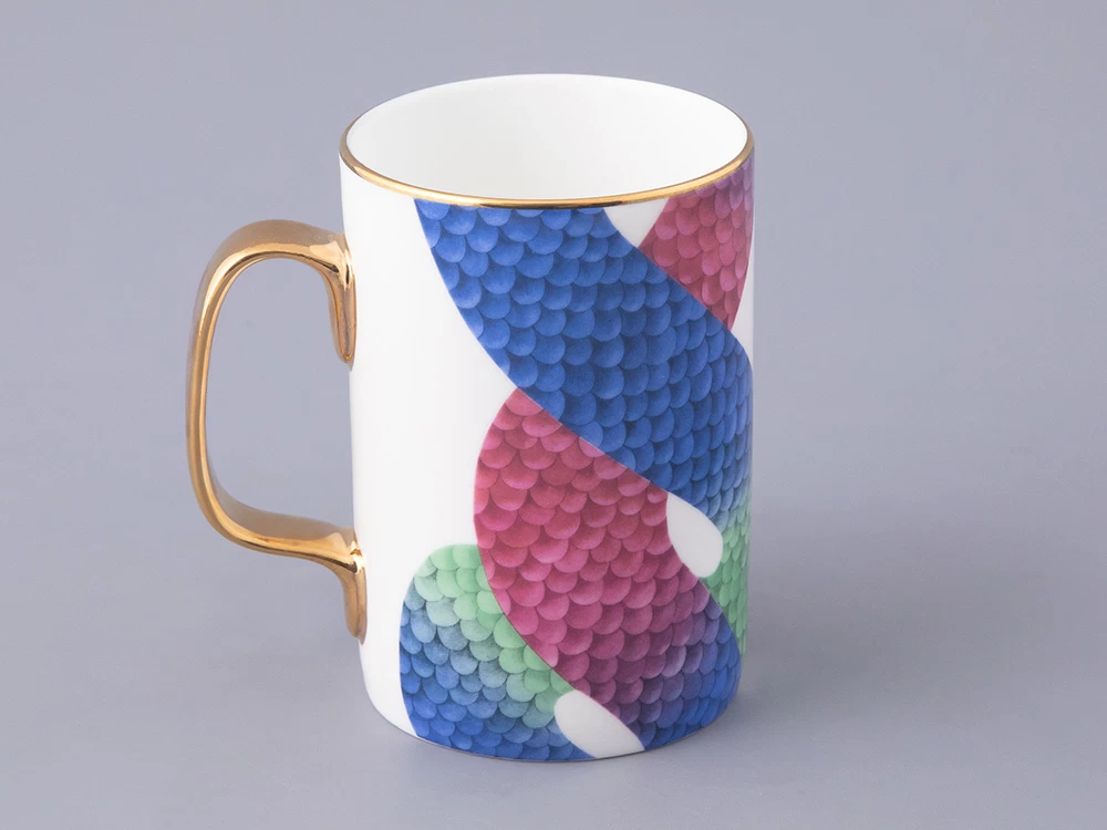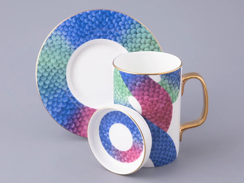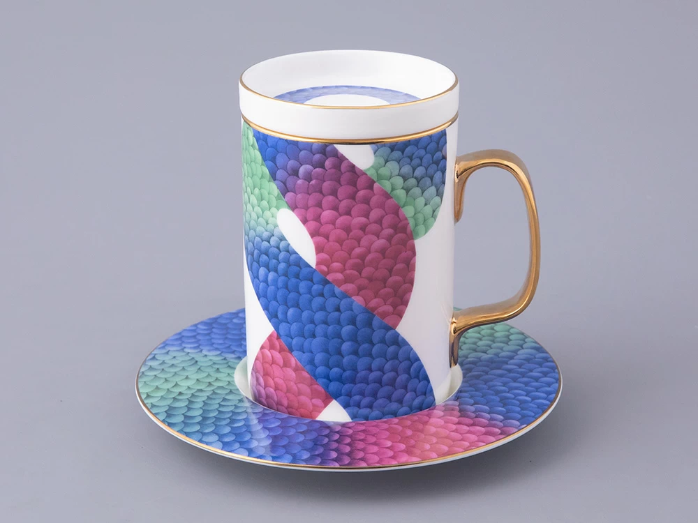 В комплекте с бокалом идут изящная крышка и блюдце, которые продолжают тему аристократизма. На каждом элементе комплекта изображен узор, вдохновленный змеиной кожей – он плавно перетекает от синего к зеленому и красному, создавая эффект игры света и тени. Этот рисунок не только украшает изделие, но и придает ему загадочность и глубину.