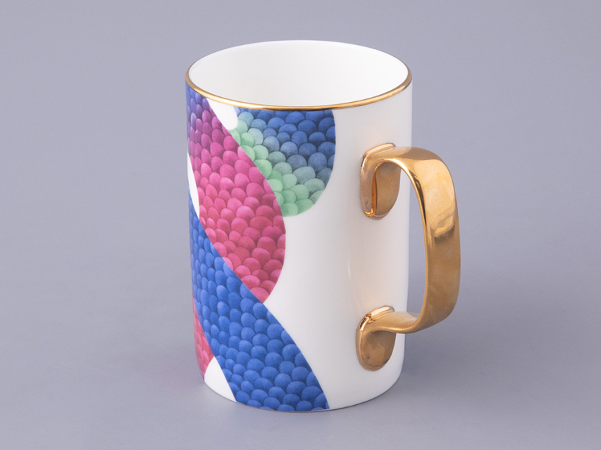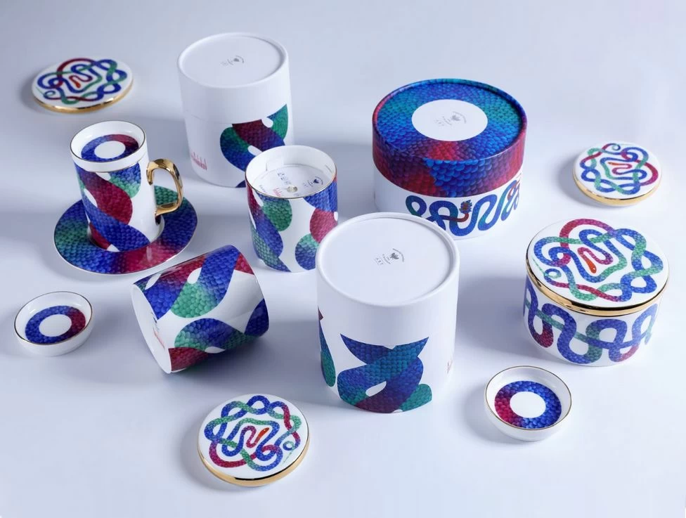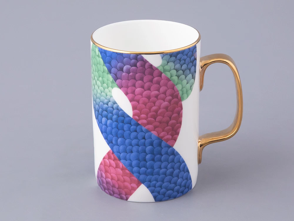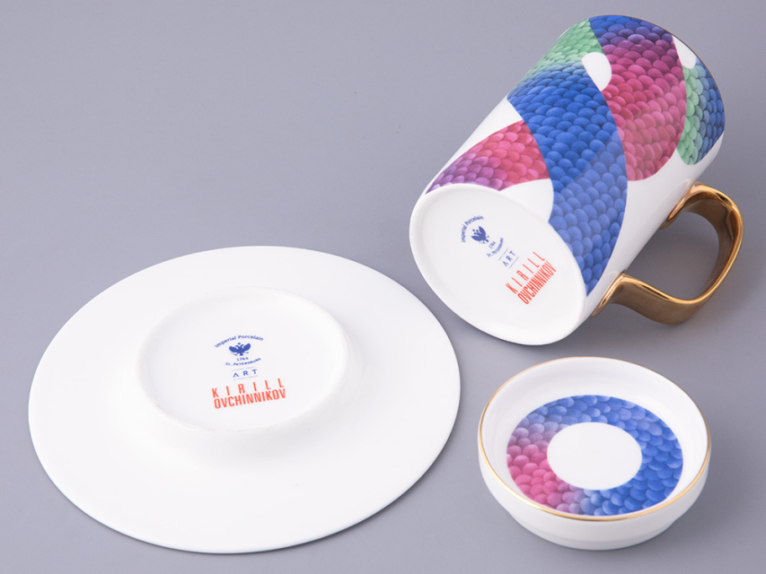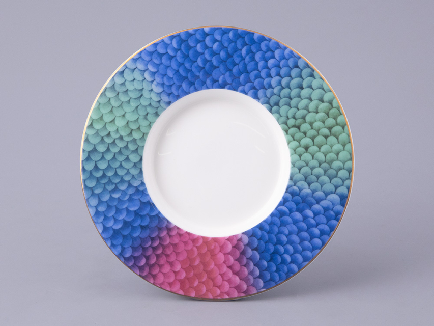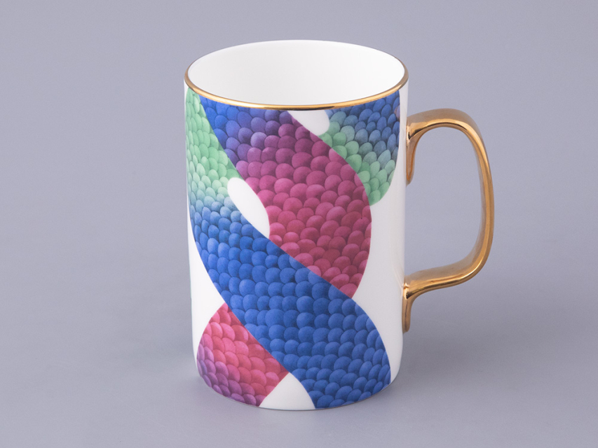 В комплекте с бокалом идут изящная крышка и блюдце, которые продолжают тему аристократизма. На каждом элементе комплекта изображен узор, вдохновленный змеиной кожей – он плавно перетекает от синего к зеленому и красному, создавая эффект игры света и тени. Этот рисунок не только украшает изделие, но и придает ему загадочность и глубину.