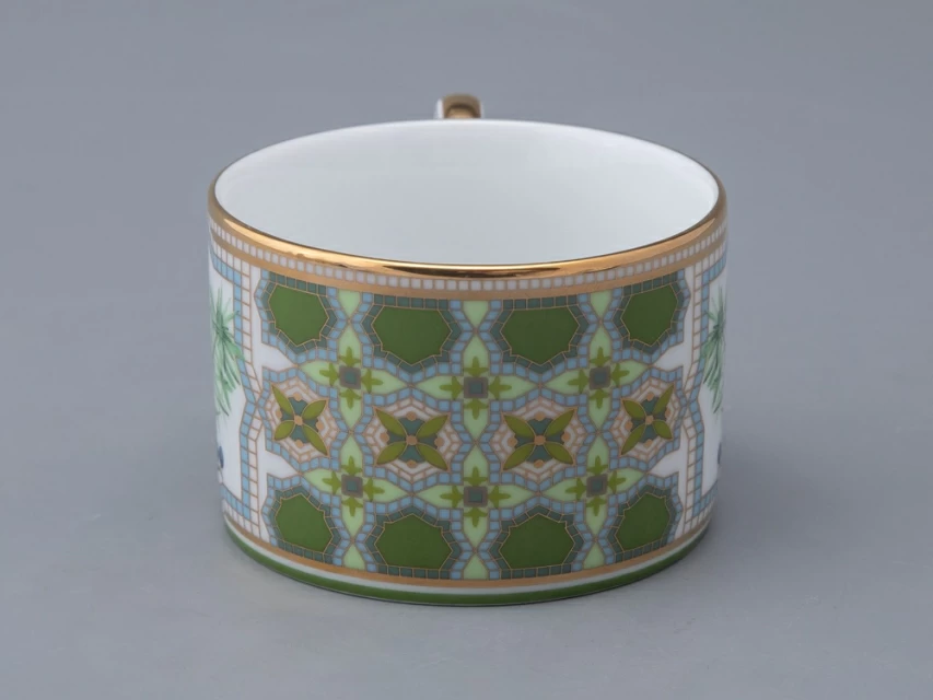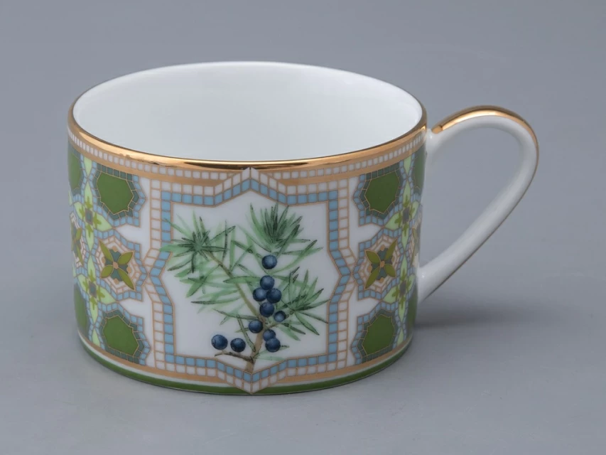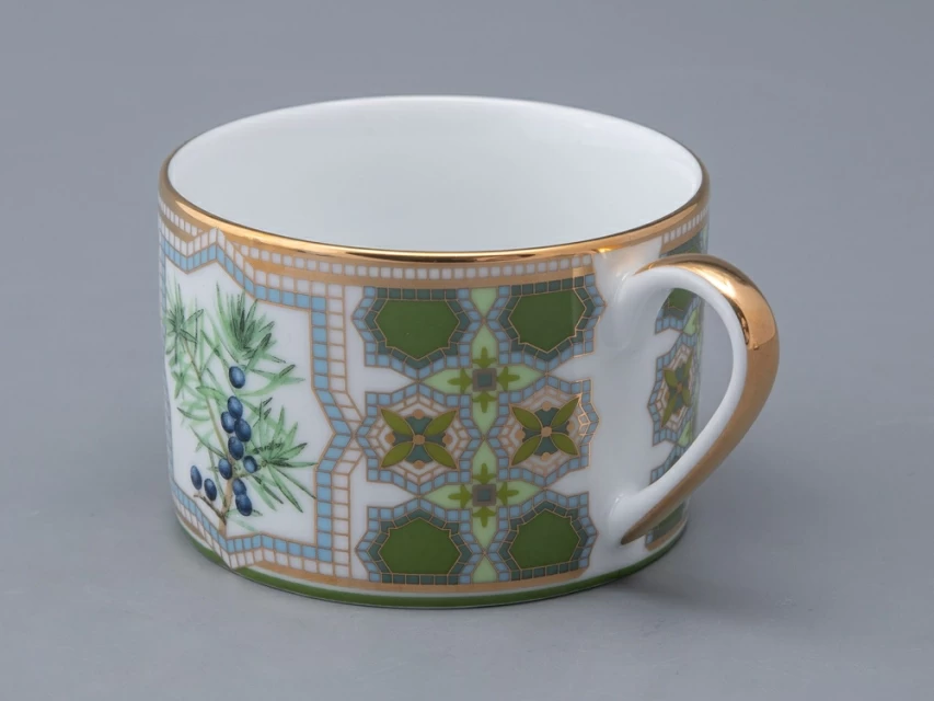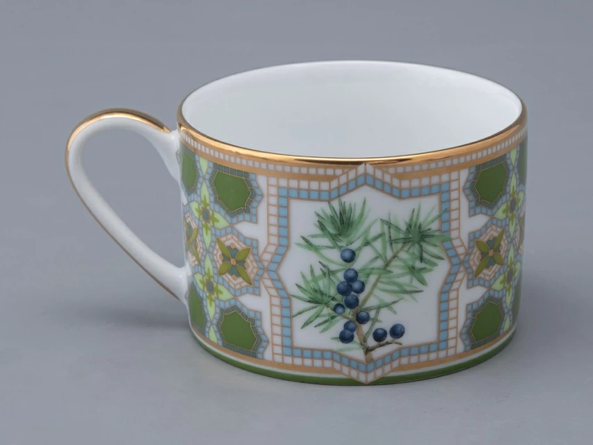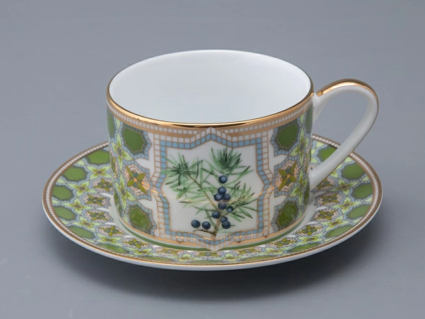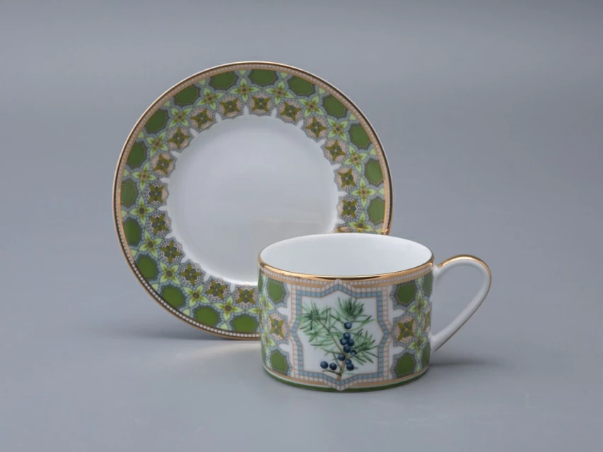 Чайная пара «Можжевельник ароматный» вошла в продолжение коллекции «Цветы и ягоды России» от художника Ольги Будашовой. В своих работах автор зачастую изображает цветы и дары природы, – такой декор остается вне времени. Используя растительные мотивы, Ольга Будашова создает предметы, которые сочетают в себе искусство и практичность. Композиция на фарфоре, выполненная в эстетике винтажных ботанических иллюстраций, дополнена орнаментальным узором – авторским размышлением на тему национальной вышивки.
