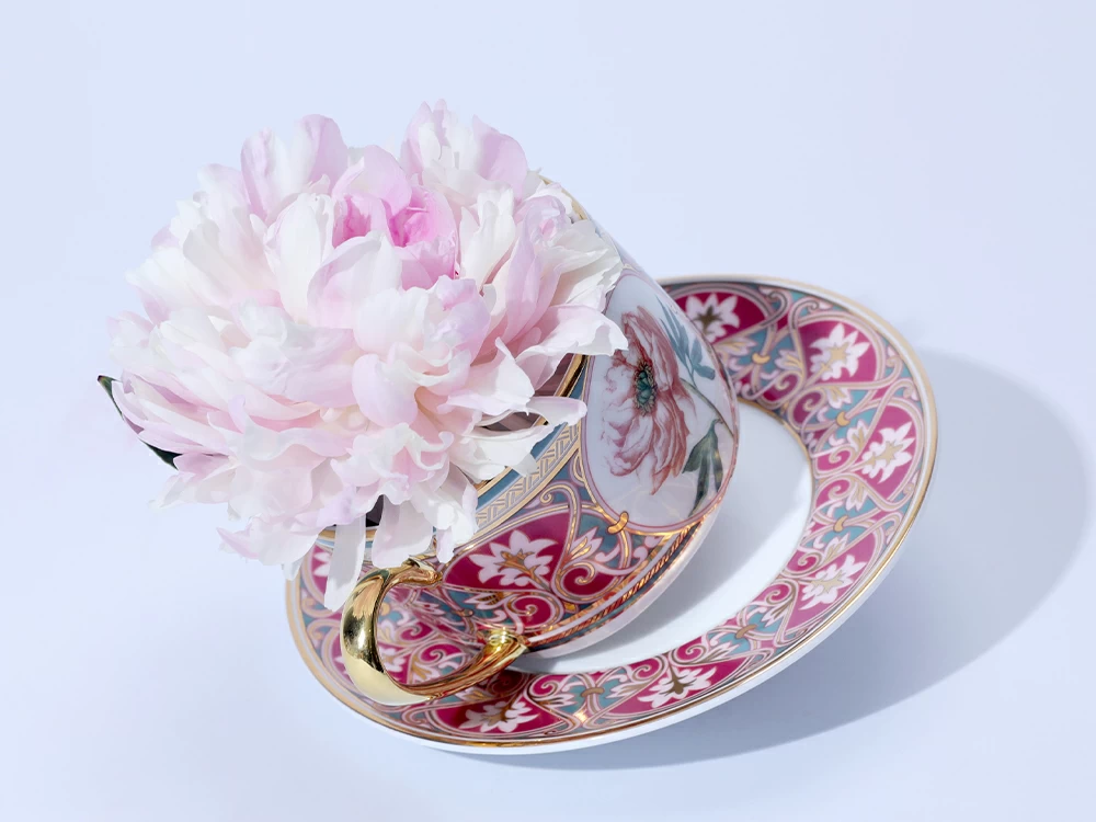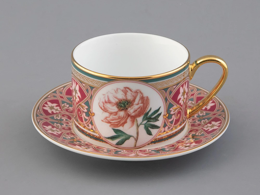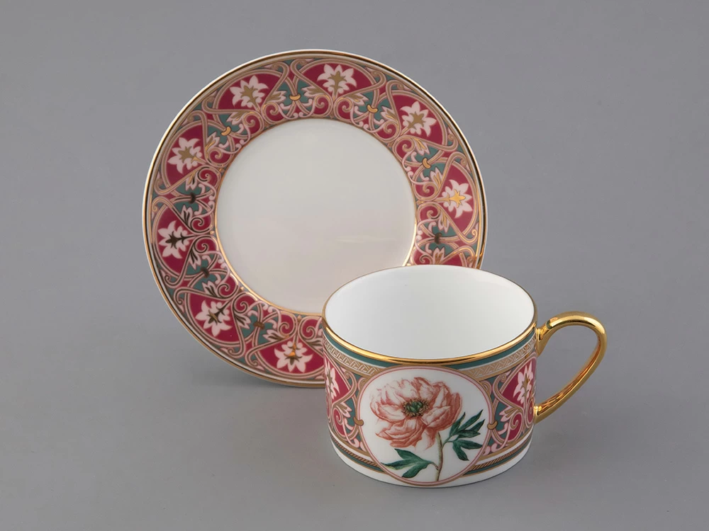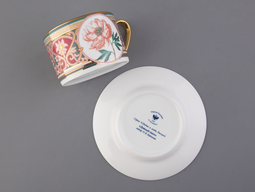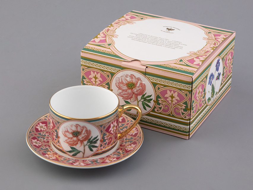 Чайная пара с изображением дивного пиона вошла в коллекцию «Цветы и ягоды России». Композиция на фарфоре, выполненная в эстетике винтажных ботанических иллюстраций, дополнена орнаментальным узором. Рисунок представляет собой авторское размышление на тему национальной вышивки.
