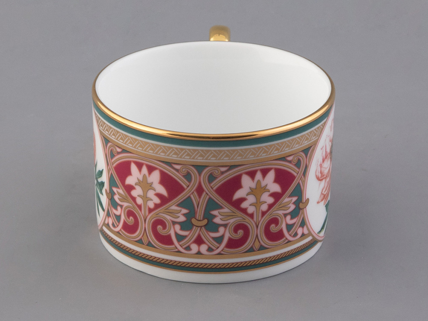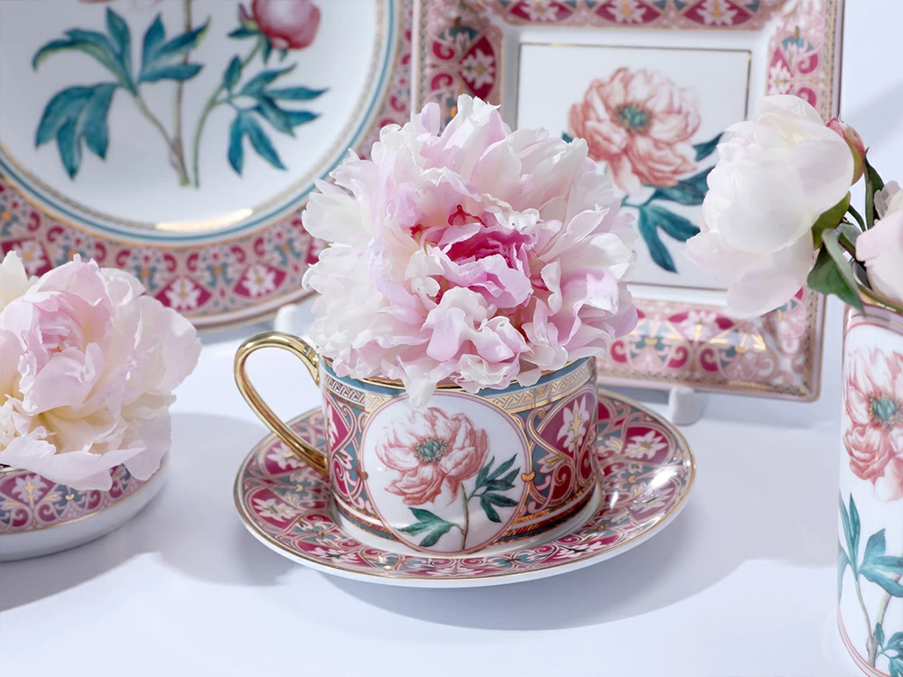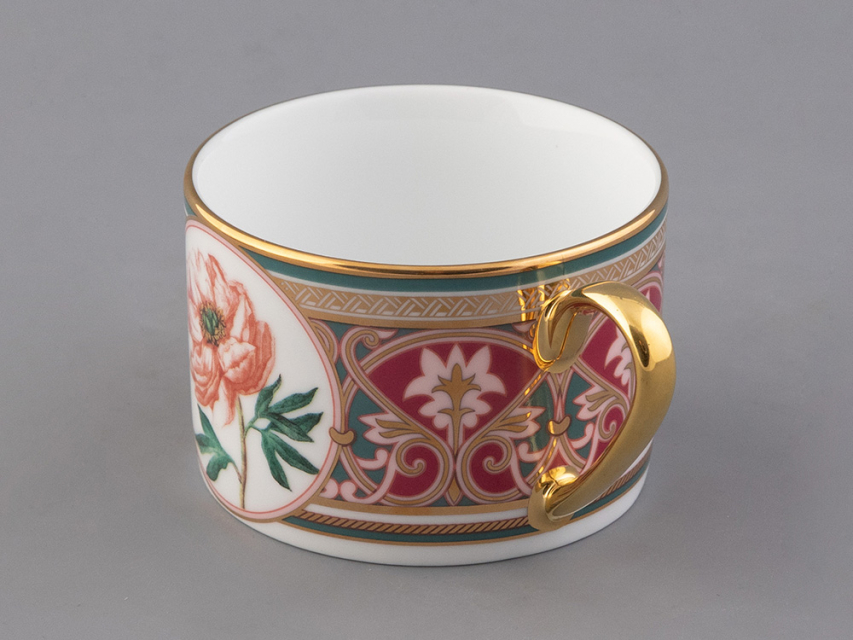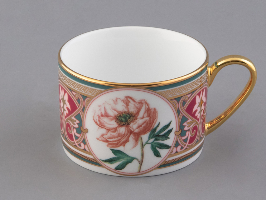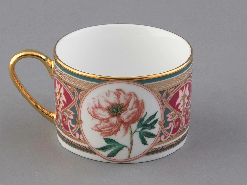 Чайная пара с изображением дивного пиона вошла в коллекцию «Цветы и ягоды России». Композиция на фарфоре, выполненная в эстетике винтажных ботанических иллюстраций, дополнена орнаментальным узором. Рисунок представляет собой авторское размышление на тему национальной вышивки.