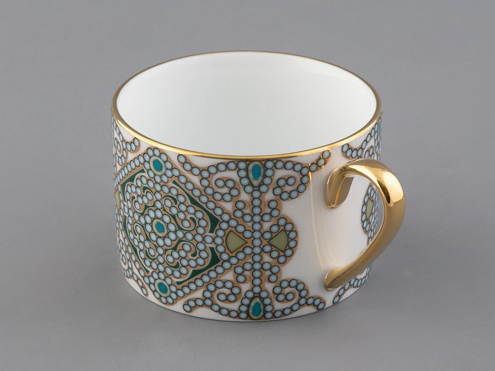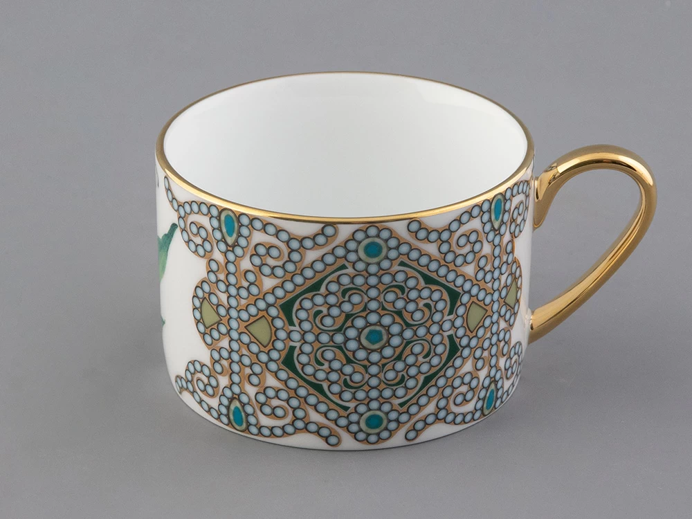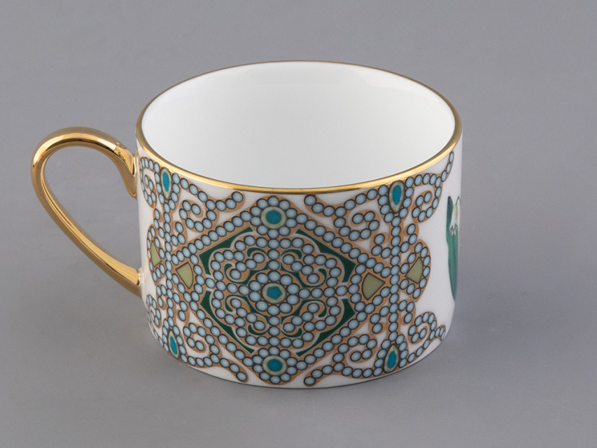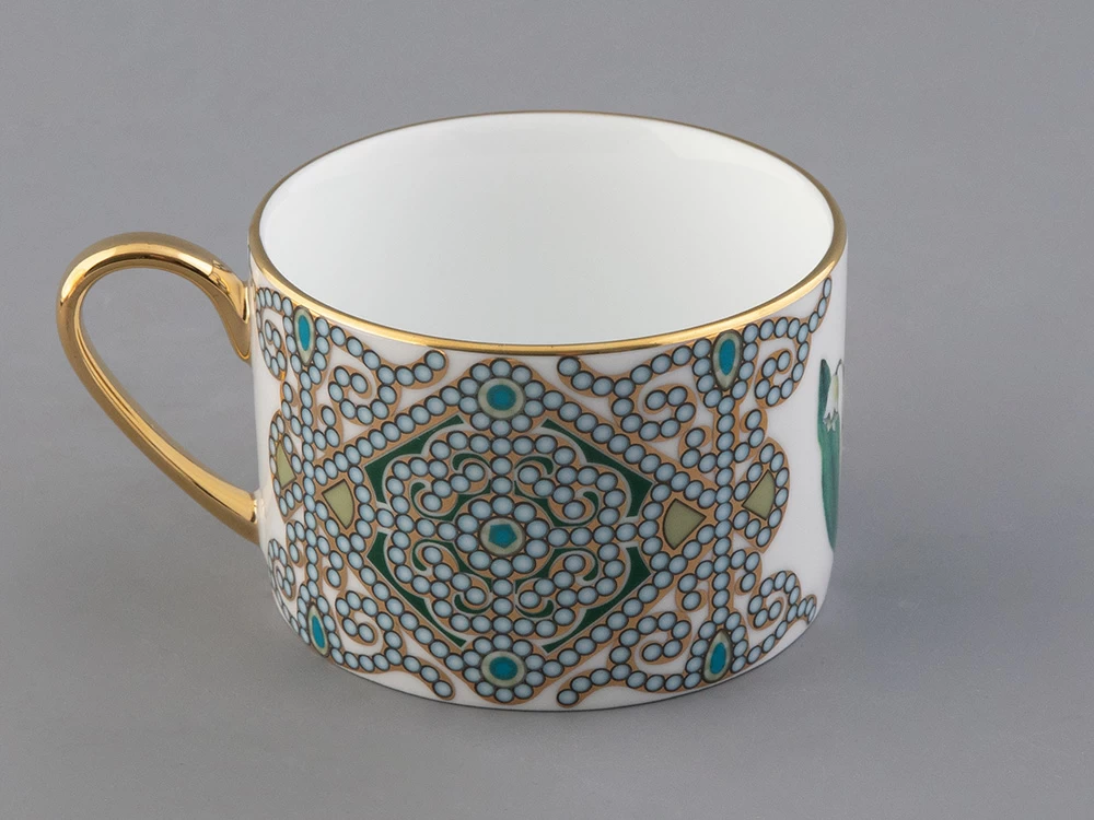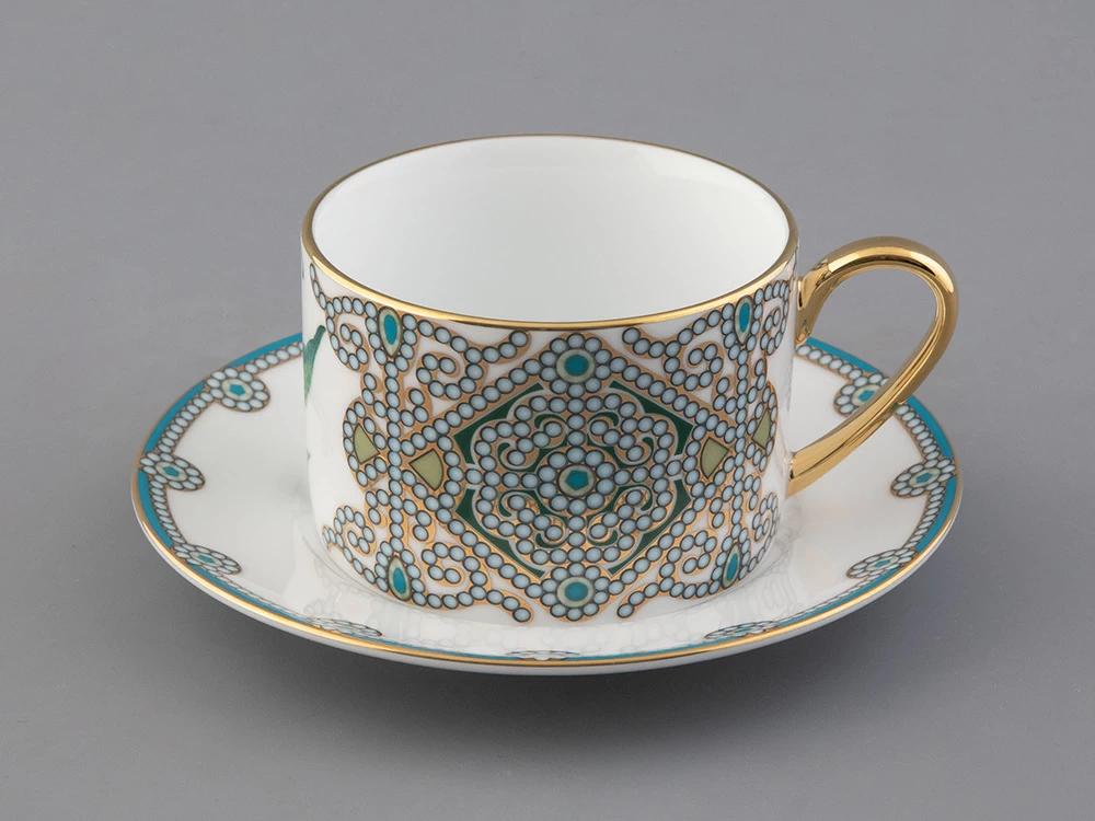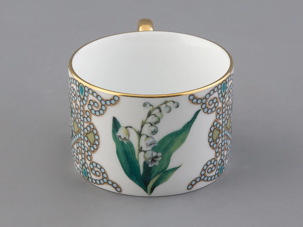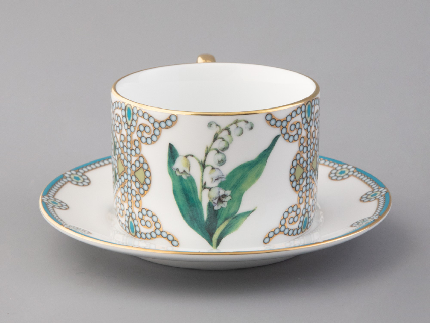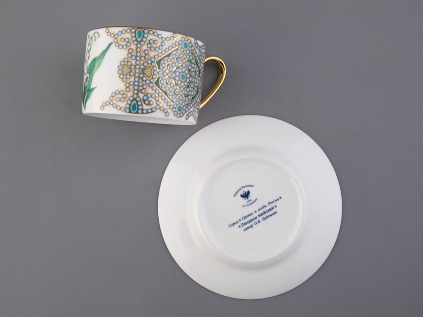 Чайная пара с майским ландышем вошла в коллекцию «Цветы и ягоды России». Композиция на фарфоре, выполненная в эстетике винтажных ботанических иллюстраций, дополнена орнаментальным узором. Рисунок представляет собой авторское размышление на тему национальной вышивки.