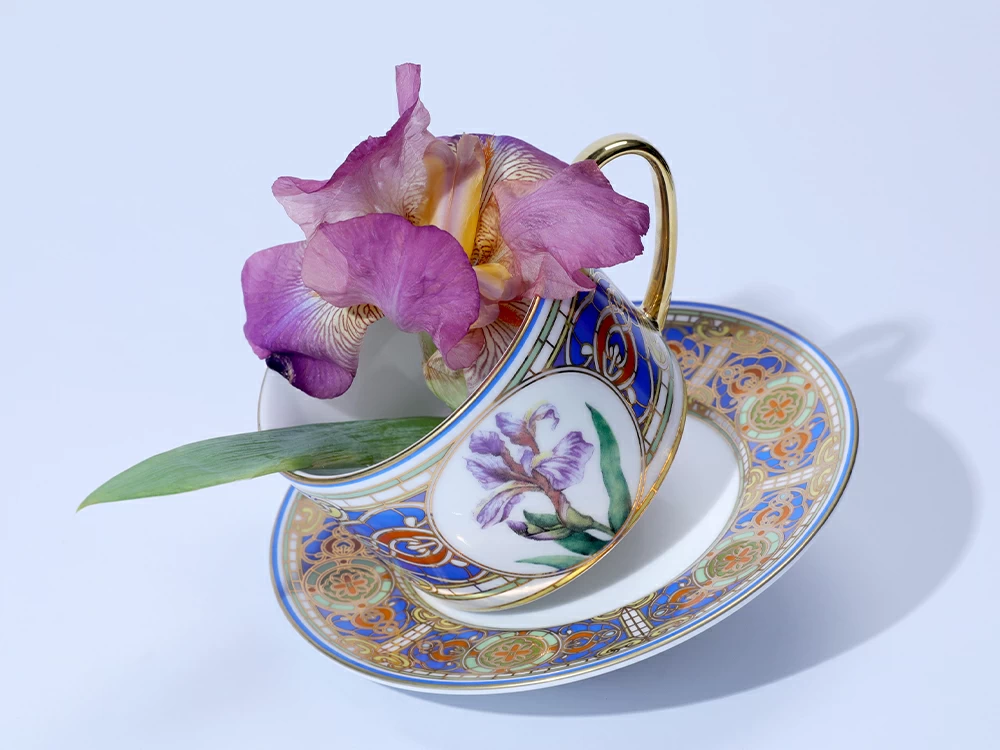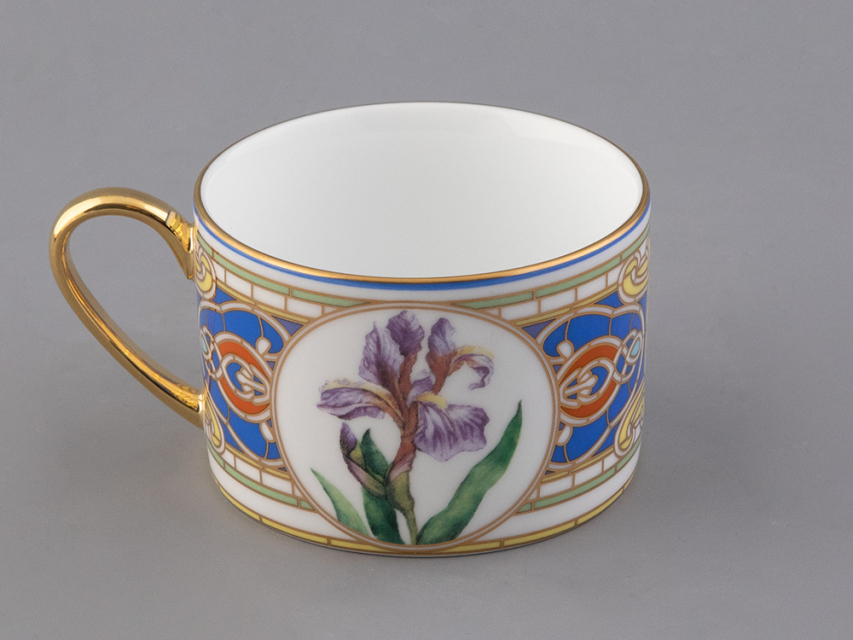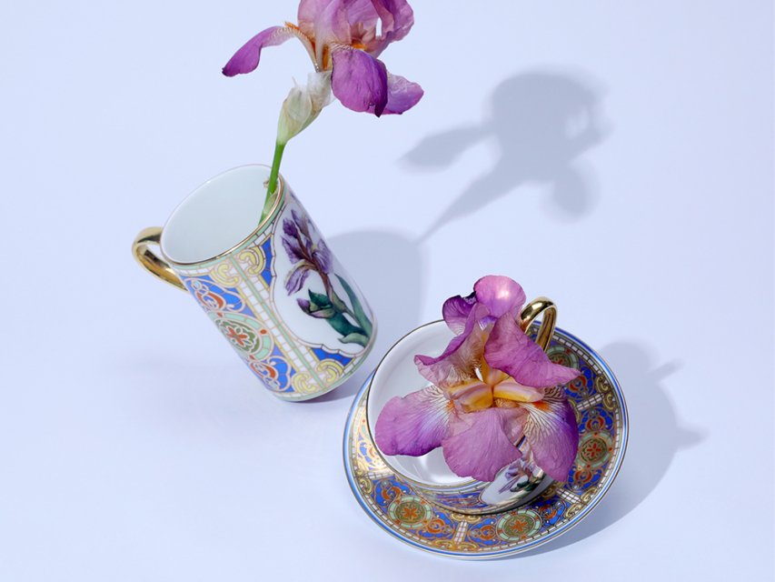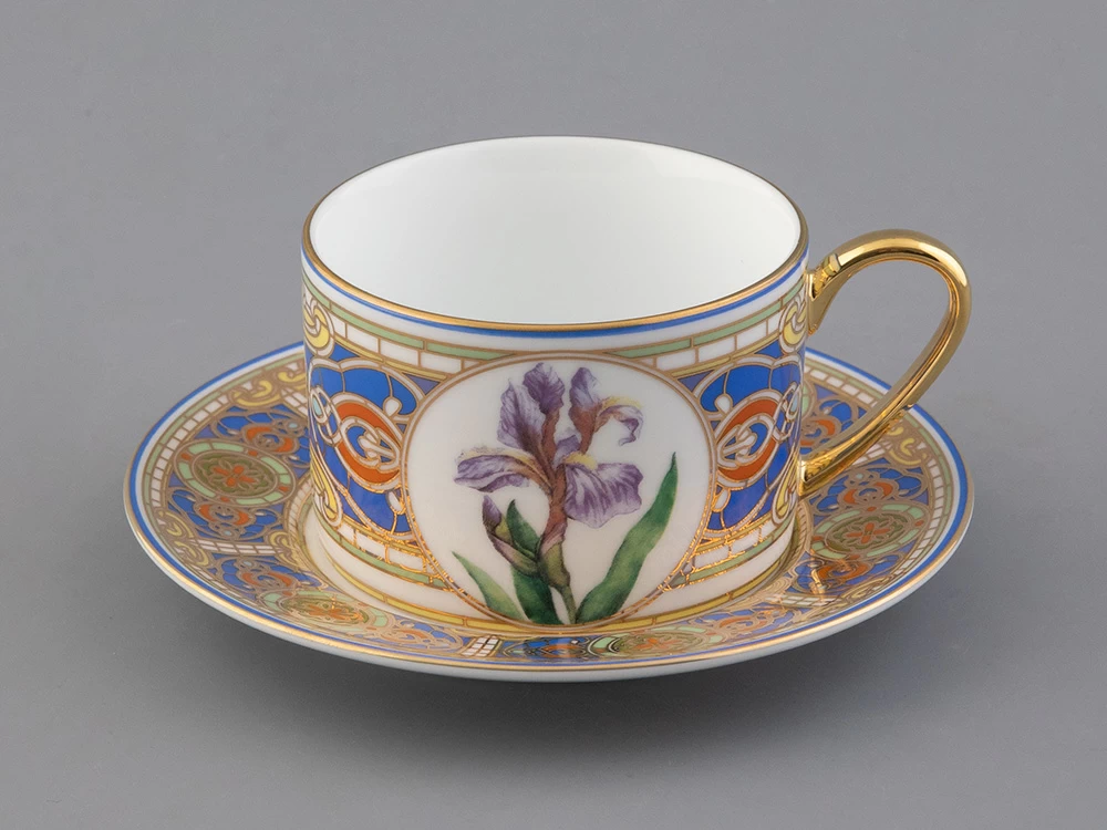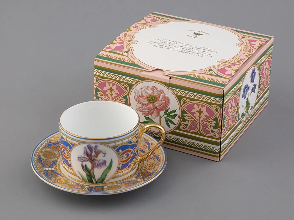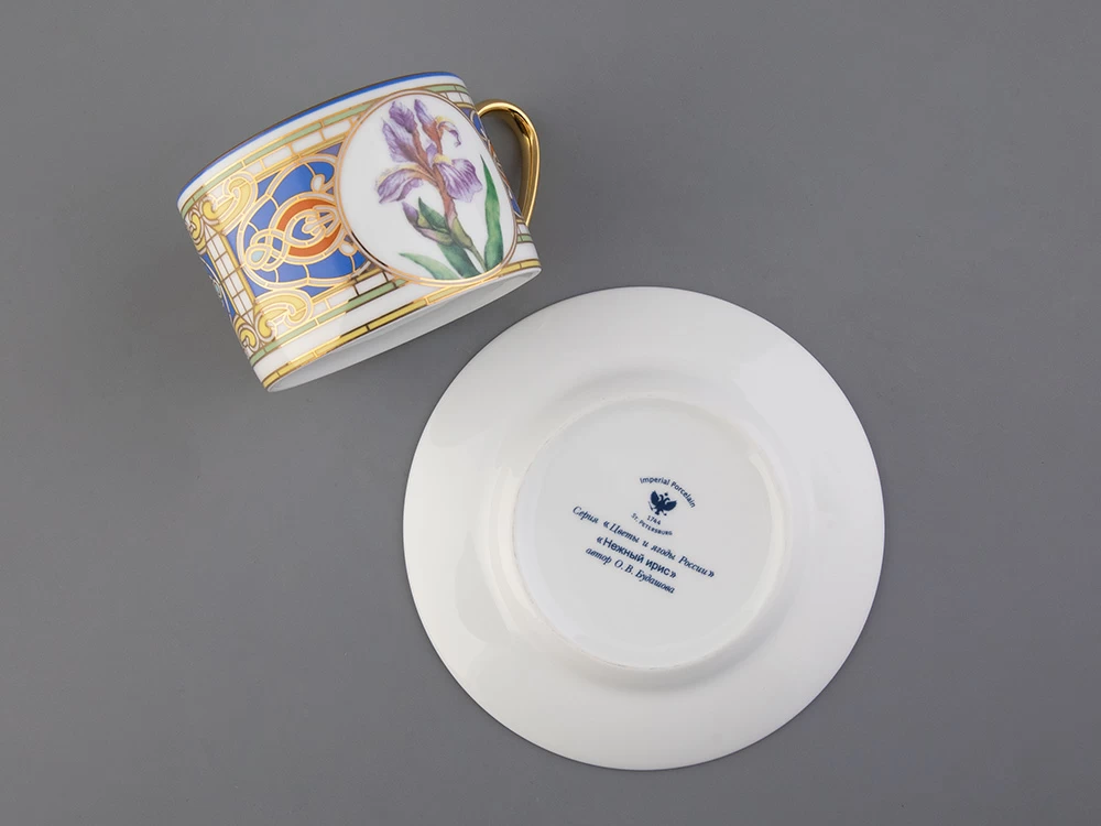 Чайная пара с нежным ирисом вошла в коллекцию «Цветы и ягоды России». Композиция на фарфоре, выполненная в эстетике винтажных ботанических иллюстраций, дополнена орнаментальным узором. Рисунок представляет собой авторское размышление на тему национальной вышивки.