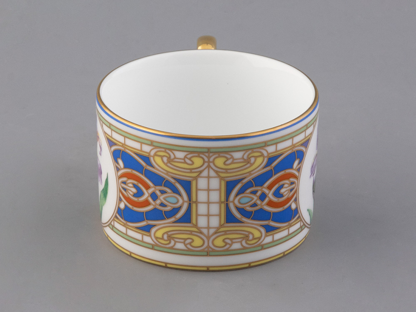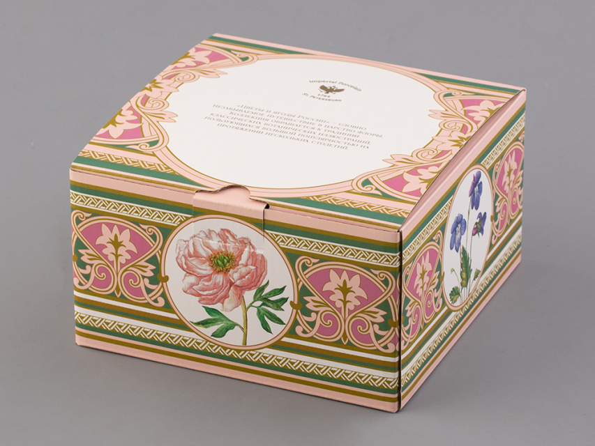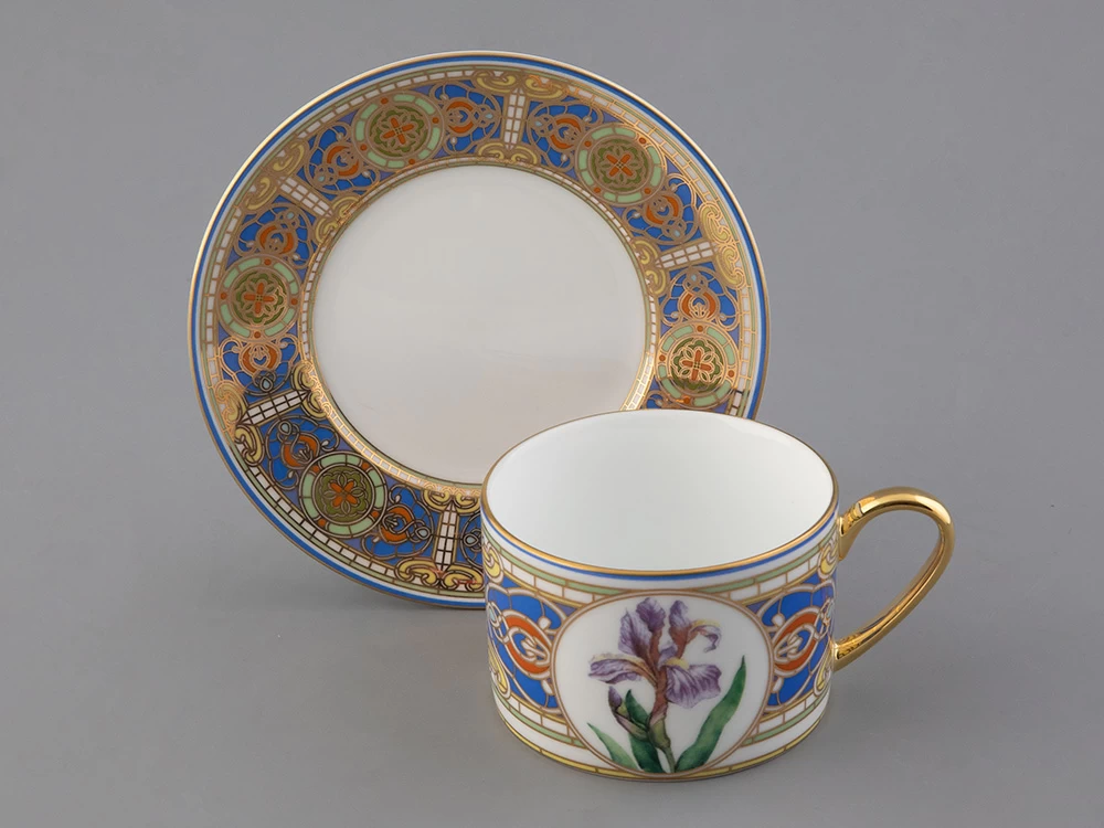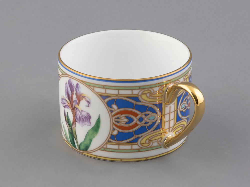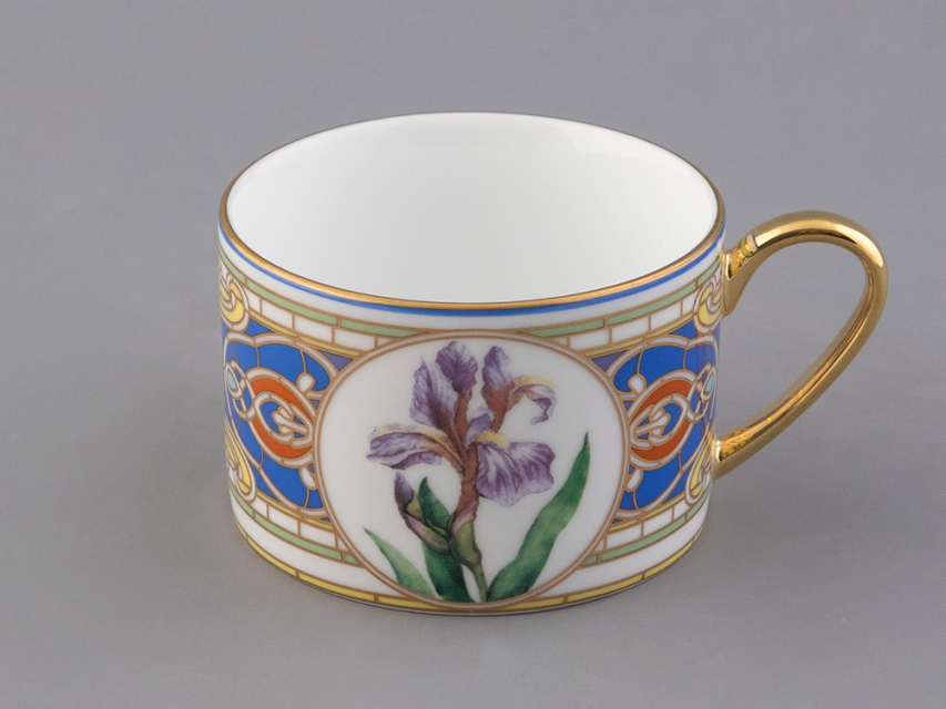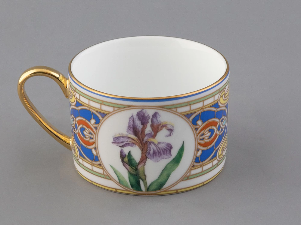 Чайная пара с нежным ирисом вошла в коллекцию «Цветы и ягоды России». Композиция на фарфоре, выполненная в эстетике винтажных ботанических иллюстраций, дополнена орнаментальным узором. Рисунок представляет собой авторское размышление на тему национальной вышивки.