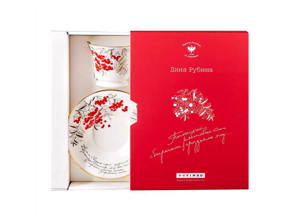 Декор чайной пары «Наполеонов обоз» вдохновлен мотивами одноименного романа писательницы Дины Рубиной. «Только веселую делай картинку! И чтобы красненького с золотом побольше, чтоб пылали гроздья рябины, чтоб горело и рдело, а вокруг – прекрасные слова…», – такое наставление дала Дина Рубина художнику Юлии Стоцкой. Благодаря совместной работе двух творцов родилась чайная пара из белоснежного костяного фарфора с «рассыпавшимися» на нем ягодами и цитатой из романа - яркая, манящая, удивительная.