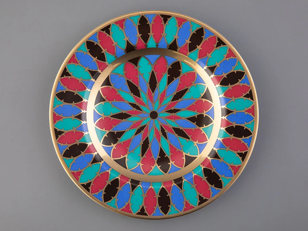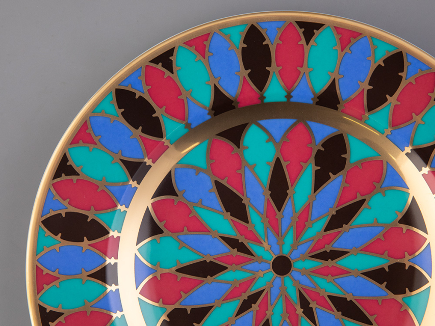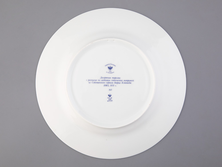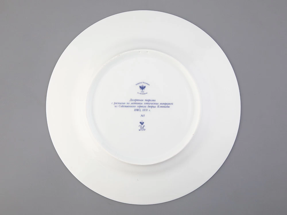 Тарелка декоративная рис. Готическая 3 изготовлена на Императорском фарфоровом заводе из твердого фарфора с элементами ручной росписи. Рисунок восстановлен по музейному образцу. Диаметр изделия - 270 мм. Изделие продается в красивой подарочной упаковке. Серия из 57 тарелок была изготовлена на Императорском фарфоровом заводе специально для Петергофского дворца «Коттедж», построенного архитектором А. Менеласом; для супруги Николая I - Императрицы Александры Федоровны. Десертные тарелки были воссозданы на Императорском фарфоровом заводе. В основу декора тарелок положен узор в виде роз средневековых витражей. В декоре использованы красные, синие и зеленые классические тона. Тарелки богато декорированы натуральным золотом.