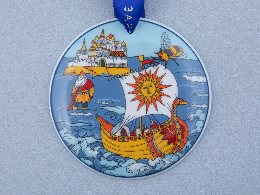 «Сказка о царе Салтане». Рисунок переносит к сказочному острову-граду Буяну, где из-за оговора завистников оказался Гвидон – сын царя Салтана. От берегов в царство славного Салтана спешит кораблик с вестями о чудесах, которыми славится княжество Гвидона. Если приглядеться, у кораблика можно увидеть шмеля – именно в него князя оборотила Царевна Лебедь.