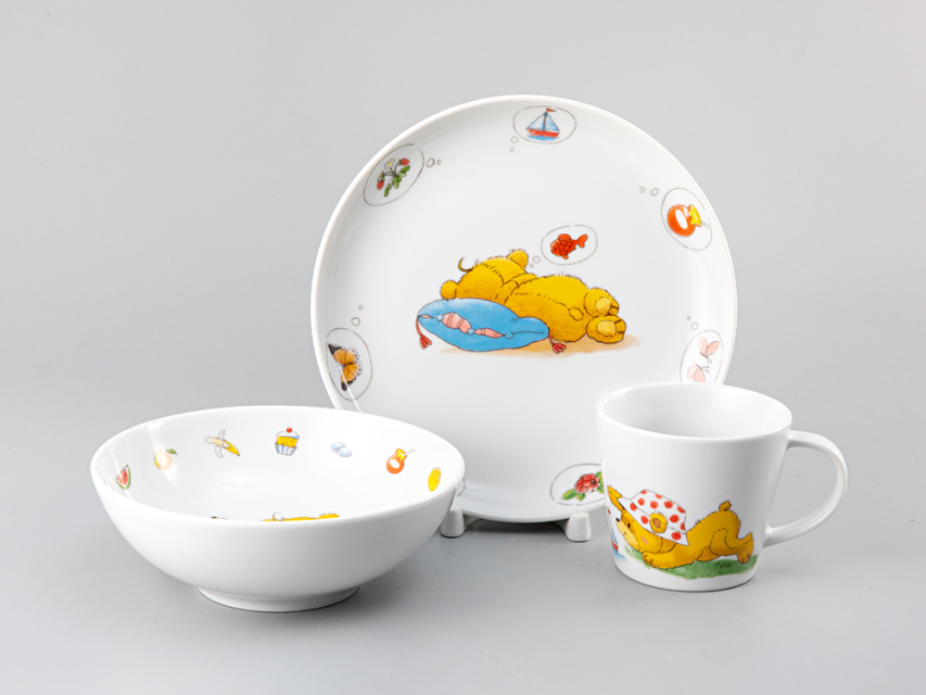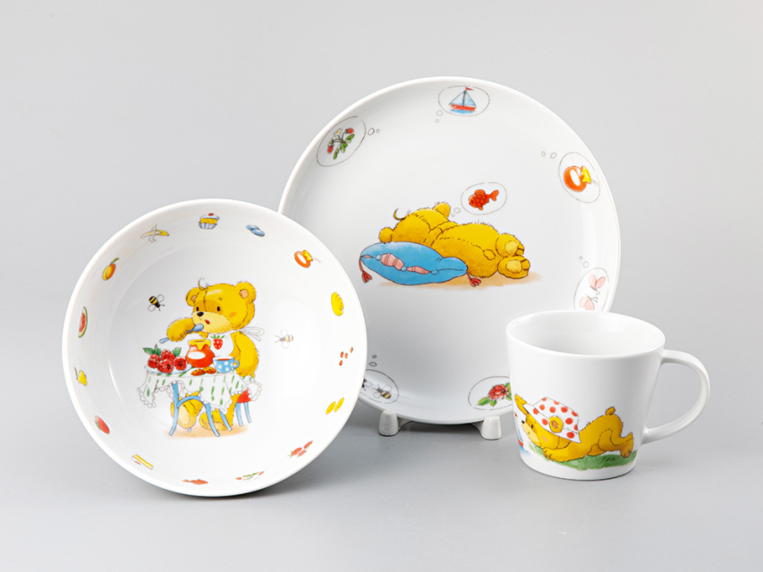 Детский набор включает в себя 3 предмета: чашка (200 мл), миска (400 мл), плоская тарелка (диаметр 19.5 см). Подарочная упаковка.