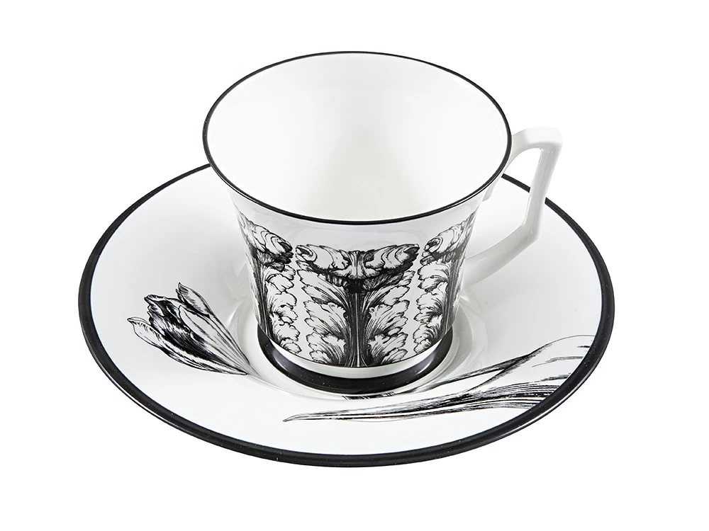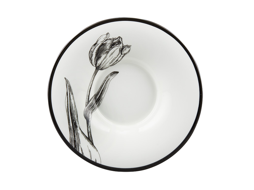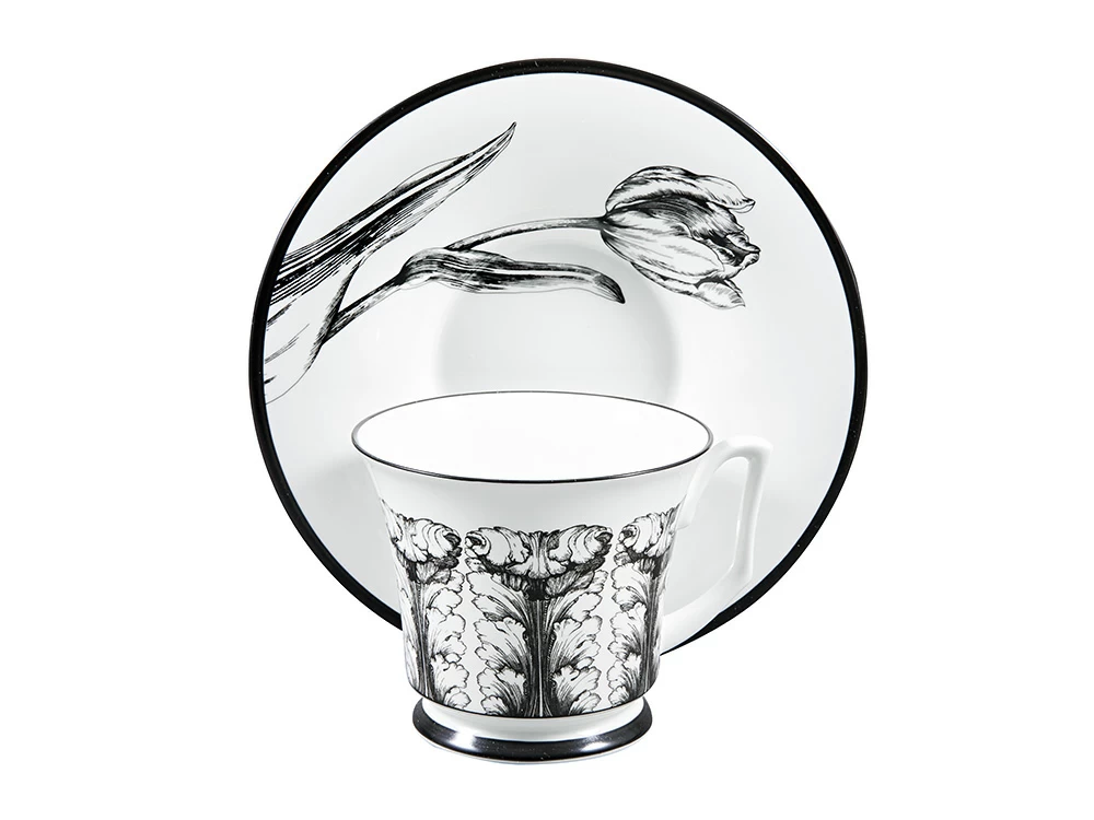 Чайная пара входит в коллекцию «Волшебный сад», созданную в коллаборации Императорского фарфорового завода и известного дизайнера Сергея Сысоева, отражает философию цветочного символизма и русской усадебной архитектуры XIX века. Элементы сервиза, соединяющие в себе внешнюю статичность архитектуры и внутреннюю динамику цветка, позволяют переместиться в пространстве и времени. Светотень каждого изображения акцентирует рельефный декор деталей садового убранства. Гирлянды и розетки, листья тропического растения – аканта, декорирующие капители ордеров, выполнены в технике гравюры – они будто переместились с холодной архитектуры на тончайший костяной фарфор. Цветок тюльпана выражает целый мир чувств, наделяет моменты жизни обновлением и спокойной созерцательностью. Исторически украшающий не только сады, но и дорогой текстиль, тюльпан особо близок Сергею Сысоеву: автор неоднократно обращается к его изображению в своих коллекциях. Каждое изделие сервиза, созданного на Императорском фарфоровом заводе – старейшем промышленном и торговом предприятии Санкт-Петербурга и России, имеет свой индивидуальный рисунок. Такая художественная стратегия создает безграничную вариативность при сервировке. Кроме того, в сервизе на шесть персон представлено два варианта чайника, что позволяет одновременно подавать к столу разные сорта чая.