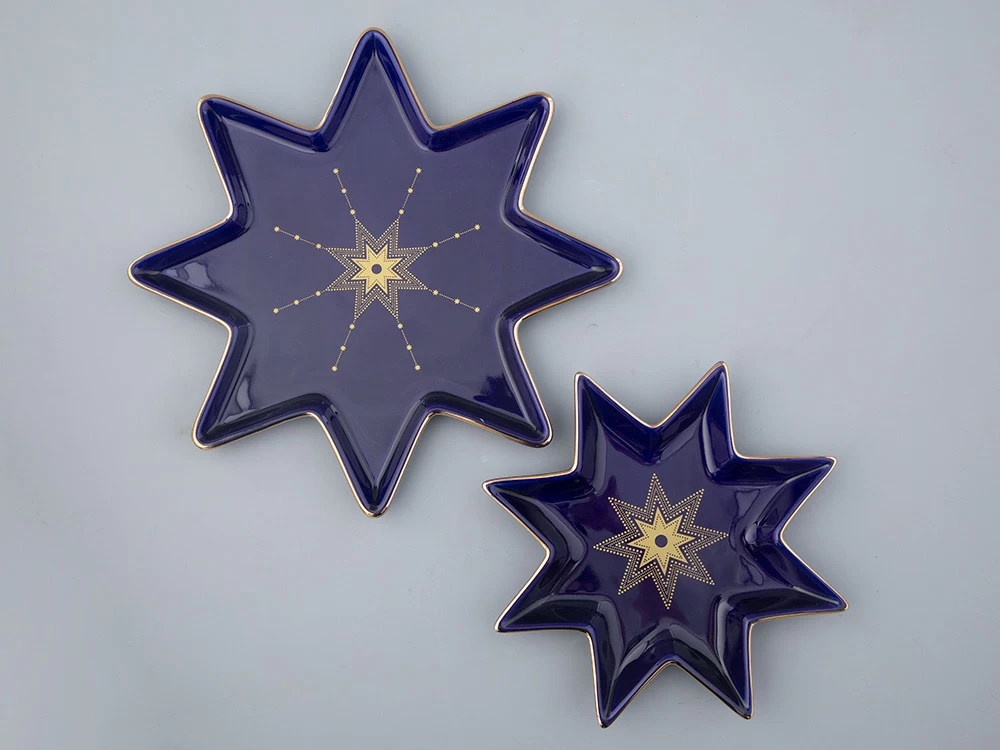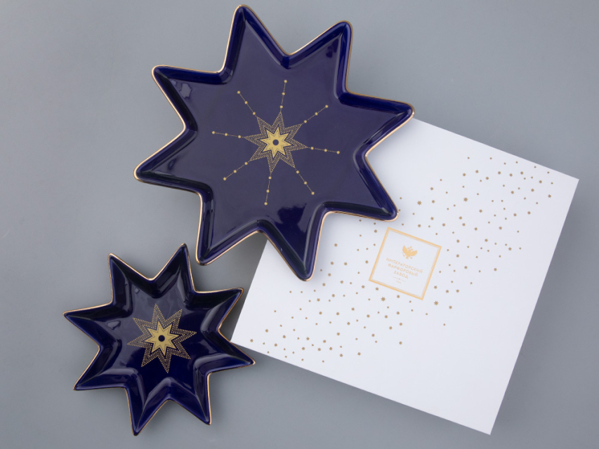 В состав подарочного набора входят две тарелки в форме звезды, дополняющие полюбившиеся ценителям фарфора коллекцию Индиго. Фарфоровые произведения, традиционно ассоциирующейся с зимними праздниками, станут достойным украшением домашнего интерьера, создав атмосферу тепла и уюта.
