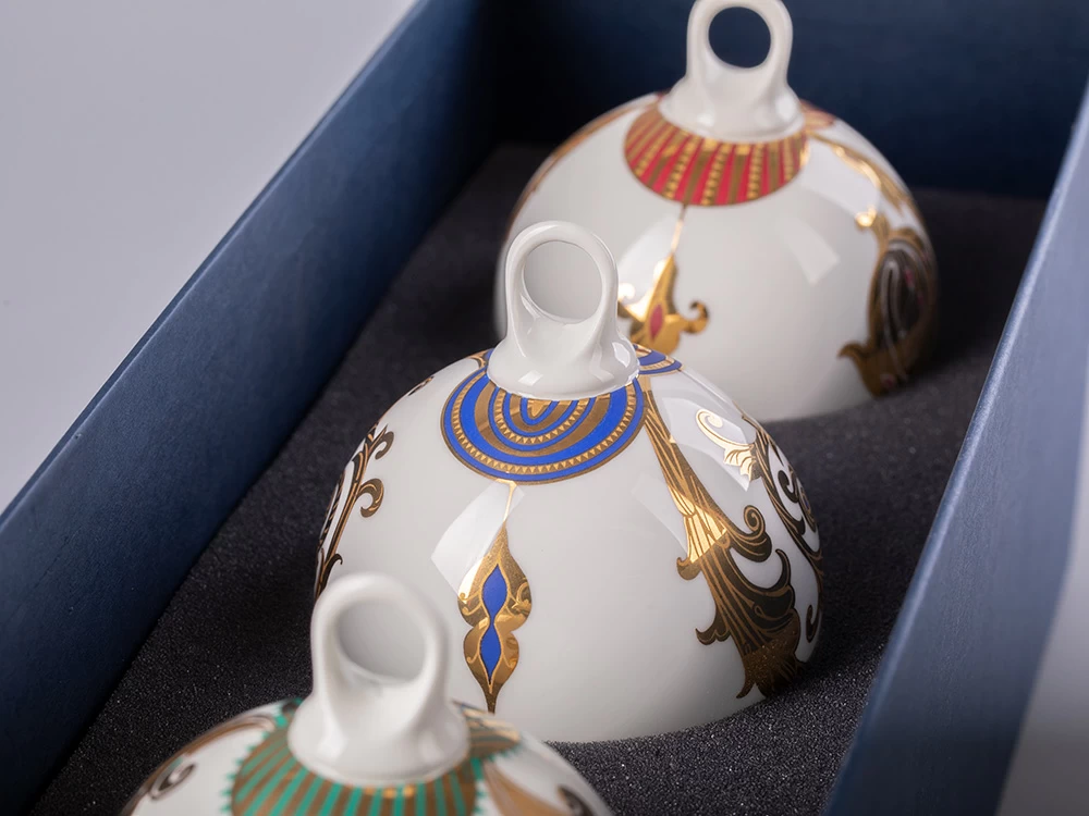 Роспись шаров "Рождественские узоры" напоминает настоящие морозные узоры на стекле – настолько элегантно автор подражает природе. Использование большого количества золота в сочетании с деликатным цветовым решением помогает подчеркнуть форму изделия и благородный оттенок фарфора. Елочные шары представлены в подарочной упаковке, благодаря чему их удобно хранить. Высокое качество подарочной упаковки делает игрушки замечательным подарком для родных, друзей и коллег.