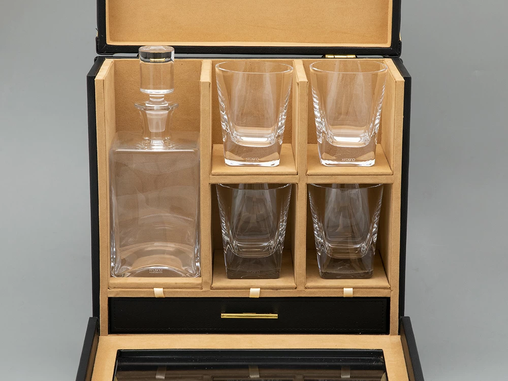 – декантер для крепких спиртных напитков и 4 стакана, выполненные вручную из высококачественного стекла на заводе в Европе;