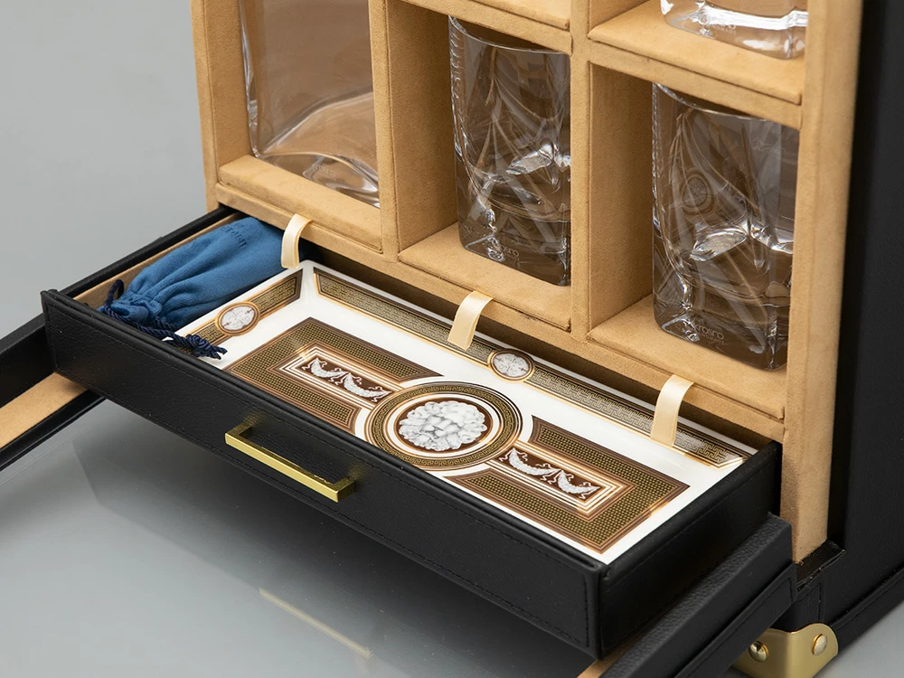 Чемодан мини-бар – эксклюзивный интерьерный аксессуар для ценителей роскоши и комфорта. Благодаря своему элегантному экстерьеру мини-бар станет особым украшением гостиной или кабинета в классическом и современном стиле.